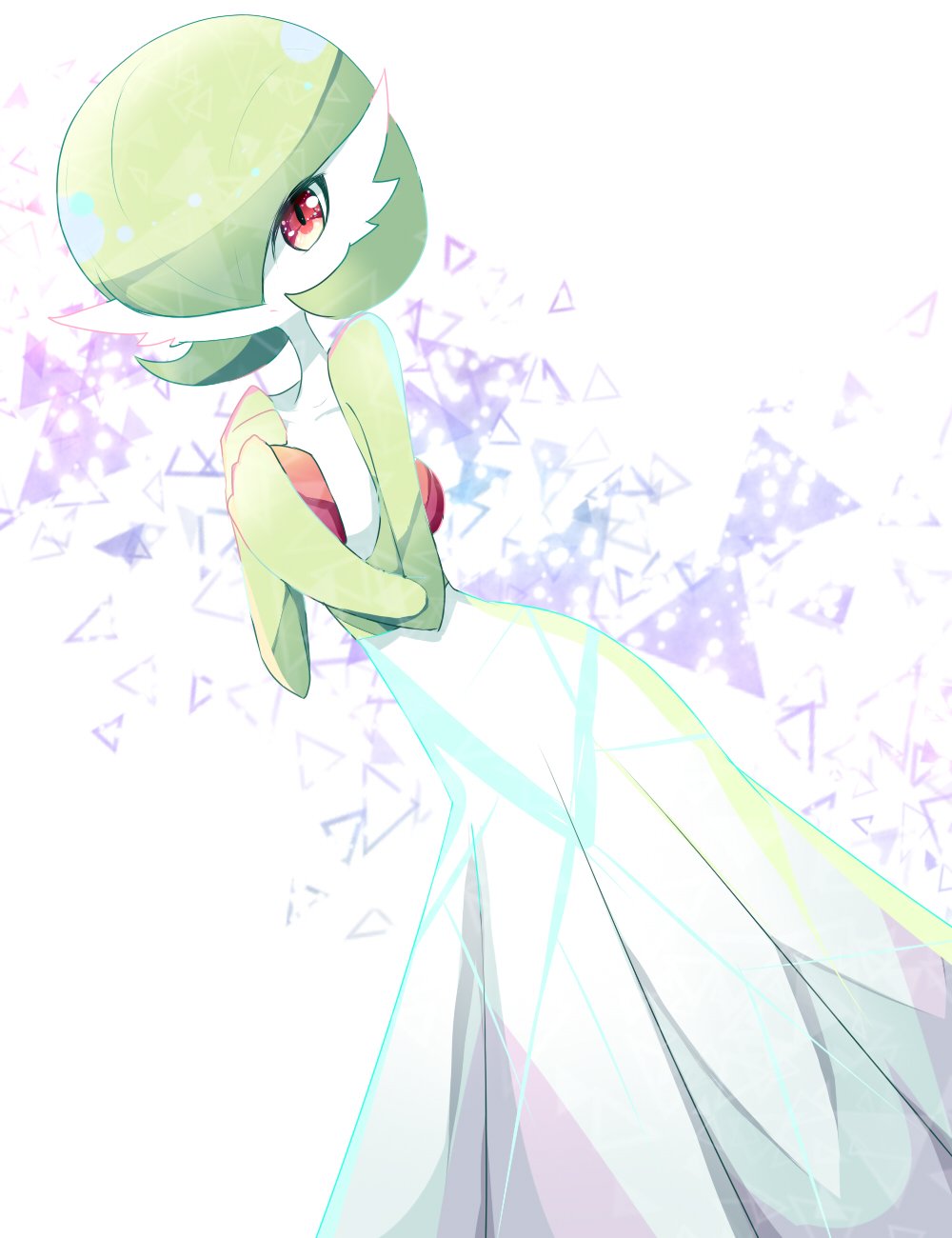 bob_cut colored_skin commentary dress gardevoir gen_3_pokemon green_hair green_skin hair_over_one_eye highres looking_at_viewer multicolored_skin nintendo own_hands_together pink_eyes pokemon pokemon_(creature) shinonome_kia two-tone_skin white_dress white_skin