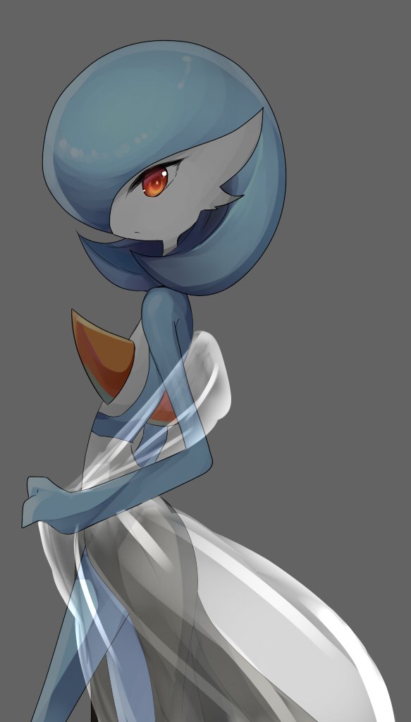 alternate_color blue_hair blue_skin colored_skin dress from_side gardevoir gen_3_pokemon grey_background multicolored_skin nintendo orange_eyes pokemon pokemon_(creature) see-through_clothes see-through_shawl shawl shinonome_kia shiny_pokemon simple_background two-tone_skin white_dress white_skin