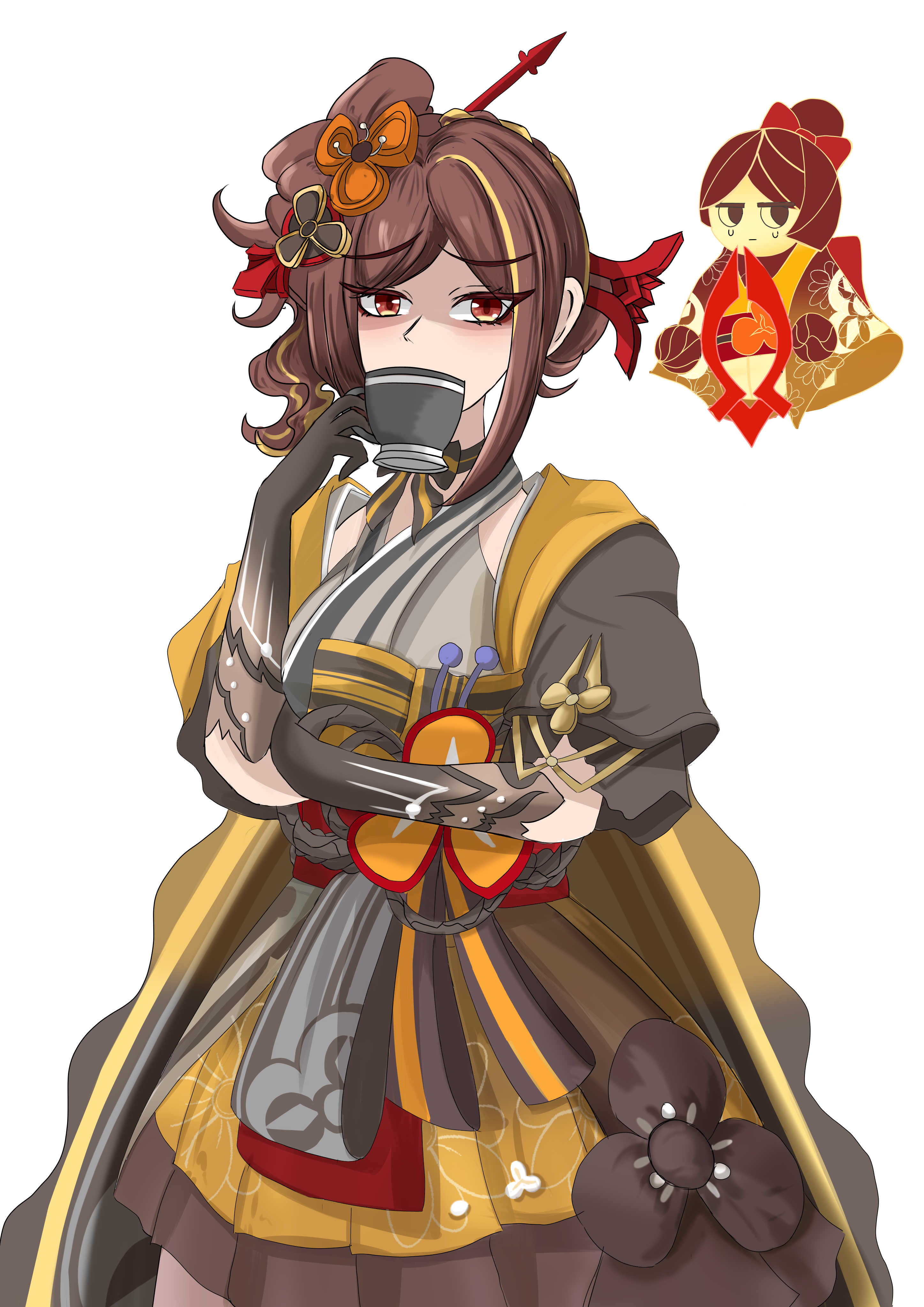1girl absurdres black_gloves brown_hair chiori_(genshin_impact) commentary commission cowboy_shot cup english_commentary falihfadh75 genshin_impact gloves grey_kimono hair_ornament hair_stick haori highres holding holding_cup japanese_clothes kimono looking_at_viewer second-party_source short_hair simple_background skirt standing tamoto_(genshin_impact) teacup white_background yellow_skirt