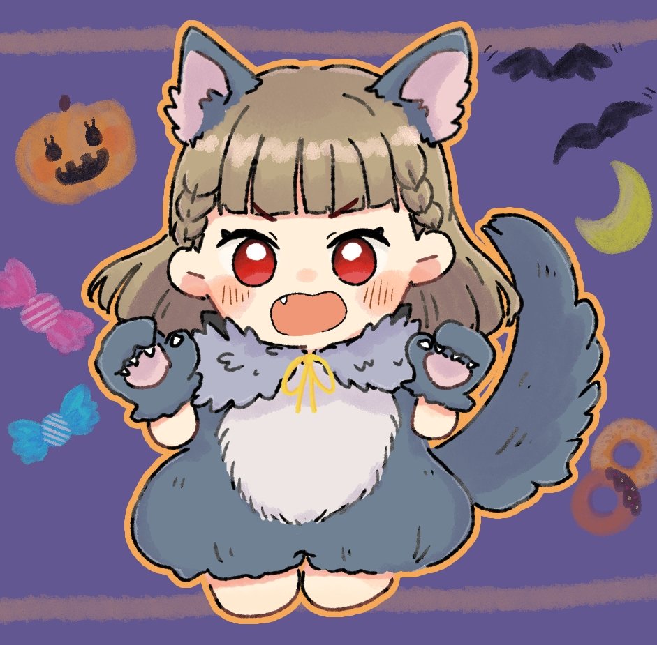 1girl animal_ears animal_hands braid brown_hair candy center-flap_bangs claw_pose commentary crescent cropped_legs donut fang food gloves jack-o'-lantern kachimachi_kosuzu link!_like!_love_live! long_hair love_live! mao_(maooo_049) open_mouth orange_outline outline paw_gloves purple_background red_eyes side_braids simple_bat solo straight_hair v-shaped_eyebrows virtual_youtuber werewolf_costume wolf_ears wrapped_candy