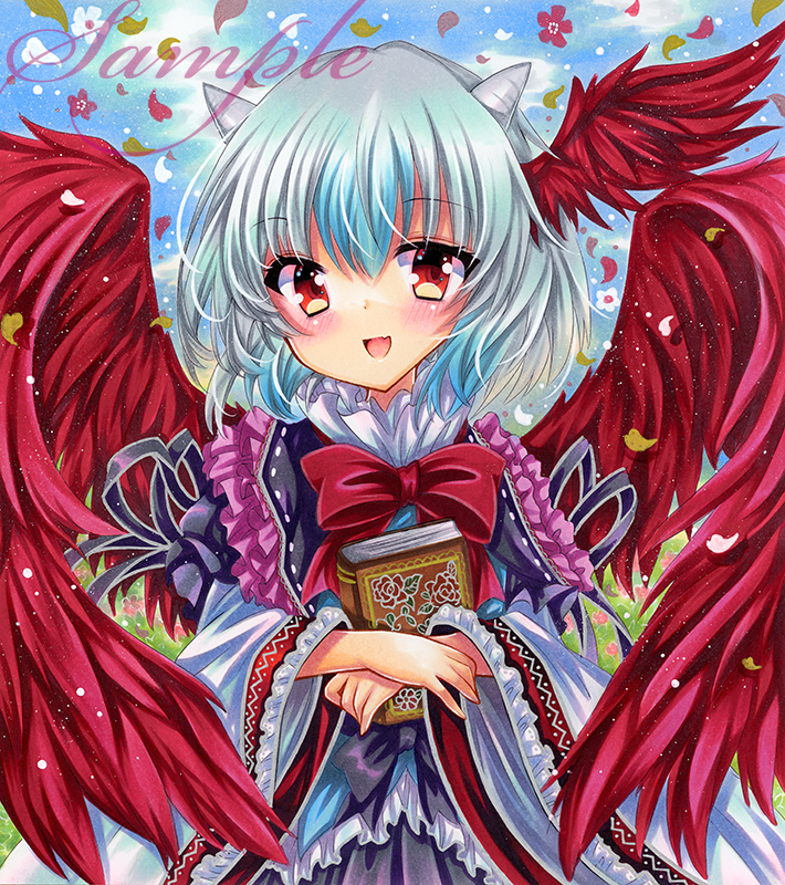 1girl :d blue_hair blush book bow bowtie commentary_request cone_horns curiosities_of_lotus_asia embellished_costume falling_petals feathered_wings gradient_hair grey_hair head_wings holding holding_book horns long_sleeves looking_at_viewer marker_(medium) multicolored_hair open_mouth petals red_bow red_bowtie red_eyes red_wings rui_(sugar3) sample_watermark single_head_wing smile solo tokiko_(touhou) touhou traditional_media watermark wide_sleeves wings