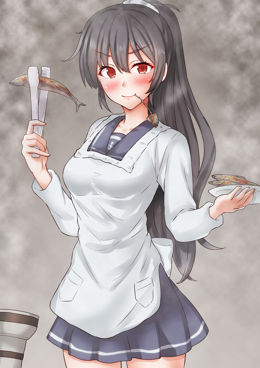 1girl anti_(untea9) apron brown_eyes commentary_request cowboy_shot fish grey_background grey_sailor_collar grey_skirt highres holding isokaze_(kancolle) isokaze_(saury_festival)_(kancolle) kantai_collection kappougi long_hair looking_at_viewer mouth_hold ponytail sailor_collar skirt smoke solo