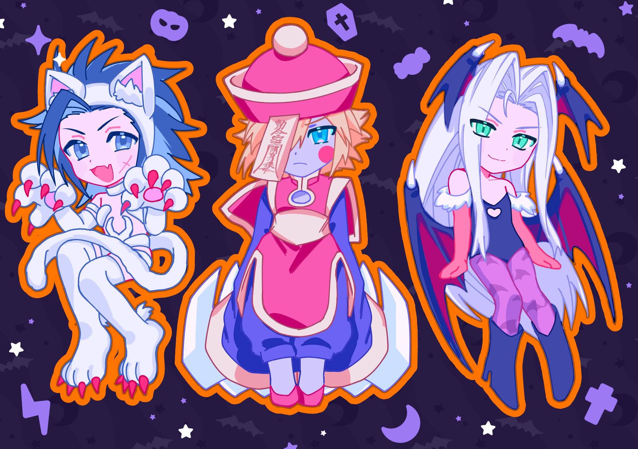 3boys animal_ears animal_hands animal_print bare_shoulders bat_(animal) bat_print bat_wings blonde_hair blue_eyes blush_stickers candy cat_ears cat_paws cat_tail chinese_clothes claw_(weapon) claws clothing_cutout cloud_strife coffin commentary cosplay crescent darkstalkers facial_scar felicia_(darkstalkers) felicia_(darkstalkers)_(cosplay) food fur-trimmed_leotard fur_trim green_eyes grey_hair halloween hat head_wings heart_cutout highres hsien-ko hsien-ko_(cosplay) jiangshi_costume keiseki1 leotard long_hair looking_at_viewer low_wings morrigan_aensland morrigan_aensland_(cosplay) multiple_boys off-shoulder_leotard open_mouth pantyhose paw_pose print_pantyhose pumpkin purple_pantyhose revealing_clothes scar scar_on_cheek scar_on_face sephiroth short_hair single_blush_sticker smile standing star_(symbol) untranslatable_commentary tail thighhighs weapon white_fur wings zack_fair