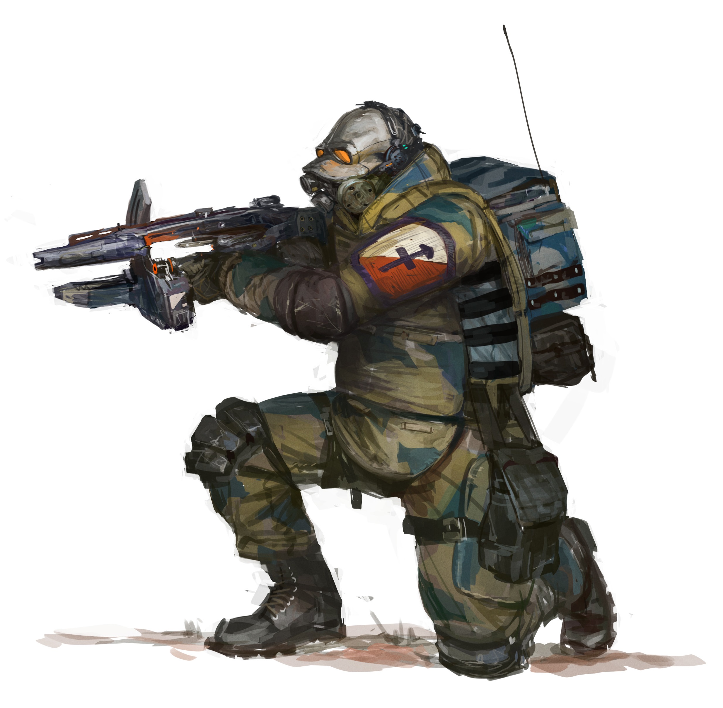 1other absurdres armor backpack bag boots combine_soldier field_radio full_armor full_body gas_mask gun half-life half-life_(series) half-life_2 highres holding holding_gun holding_weapon mask on_one_knee overwatch_standard_issue_pulse_rifle radio_antenna solo tinted_eyewear weapon whaleoil yellow-tinted_eyewear