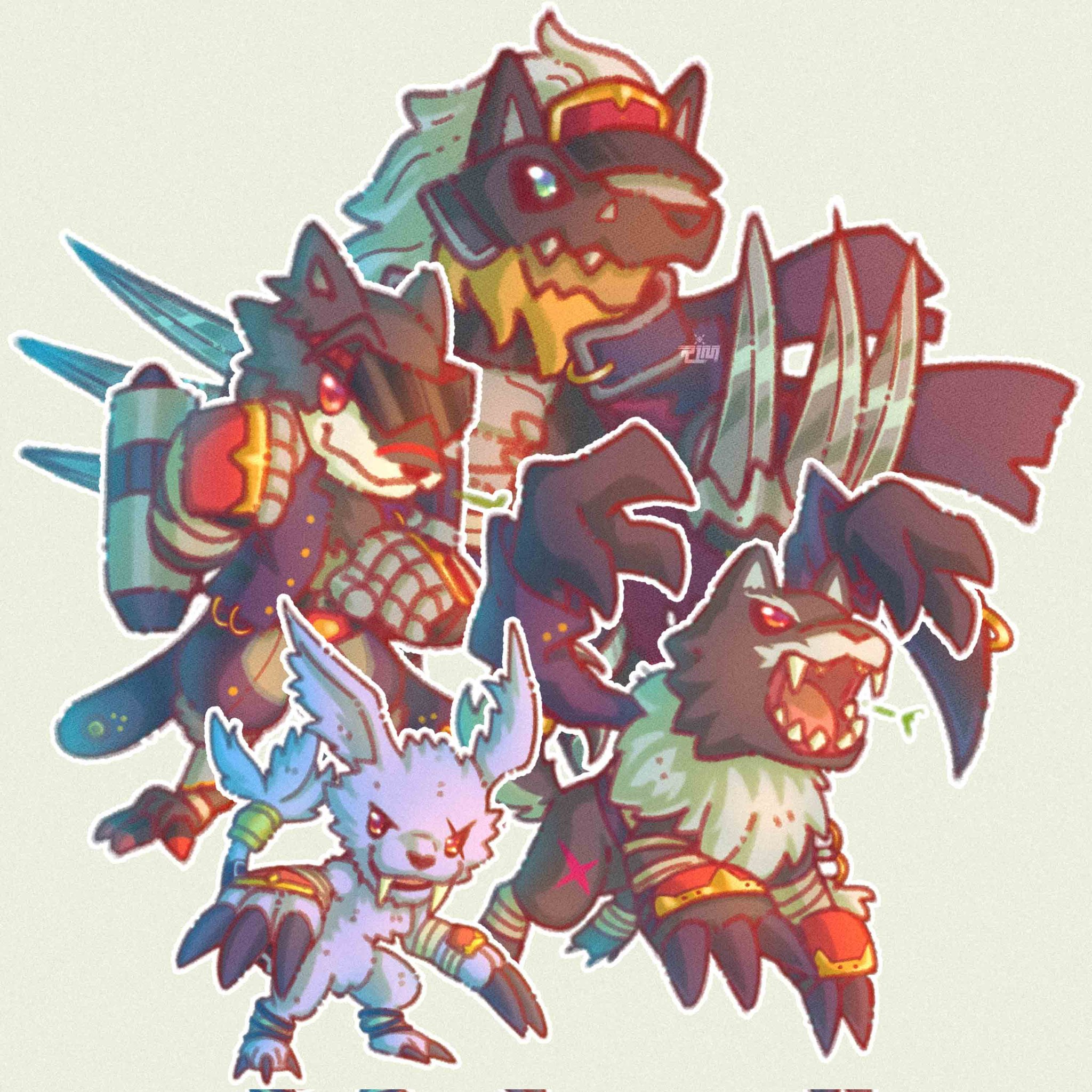 banchou blackgaogamon blackmachgaogamon claws delinquent digimon digimon_(creature) evolutionary_line gazimon highres jewelry looking_at_viewer miragegaogamon oridigi ring