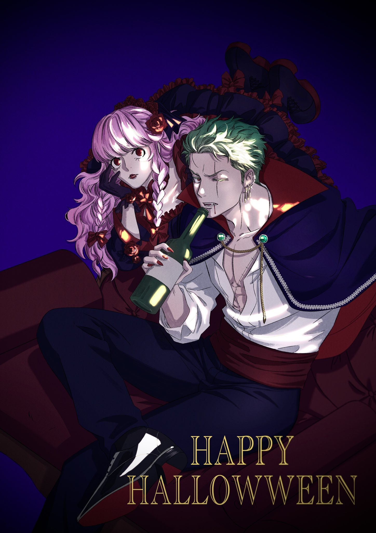 1boy 1girl bilone_88 black_gloves black_pants blunt_bangs bottle braid cape commentary_request couch dress earrings fangs frilled_dress frills gloves green_hair happy_halloween highres holding holding_bottle jewelry korean_commentary long_hair looking_at_viewer on_couch one_eye_closed one_piece pants perona pink_hair red_eyes red_nails roronoa_zoro sash scar scar_across_eye scar_on_face shirt short_hair stitched_torso stitches white_shirt