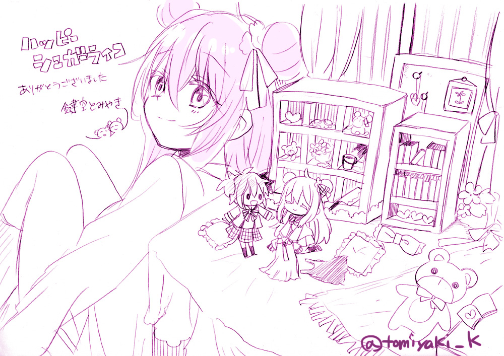 book bookshelf character_doll chibi doll double_bun hair_bun happy_sugar_life kagisora_tomiyaki koube_shio long_hair matsuzaka_satou monochrome official_art pink_theme sitting sketch smile stuffed_animal stuffed_toy teddy_bear