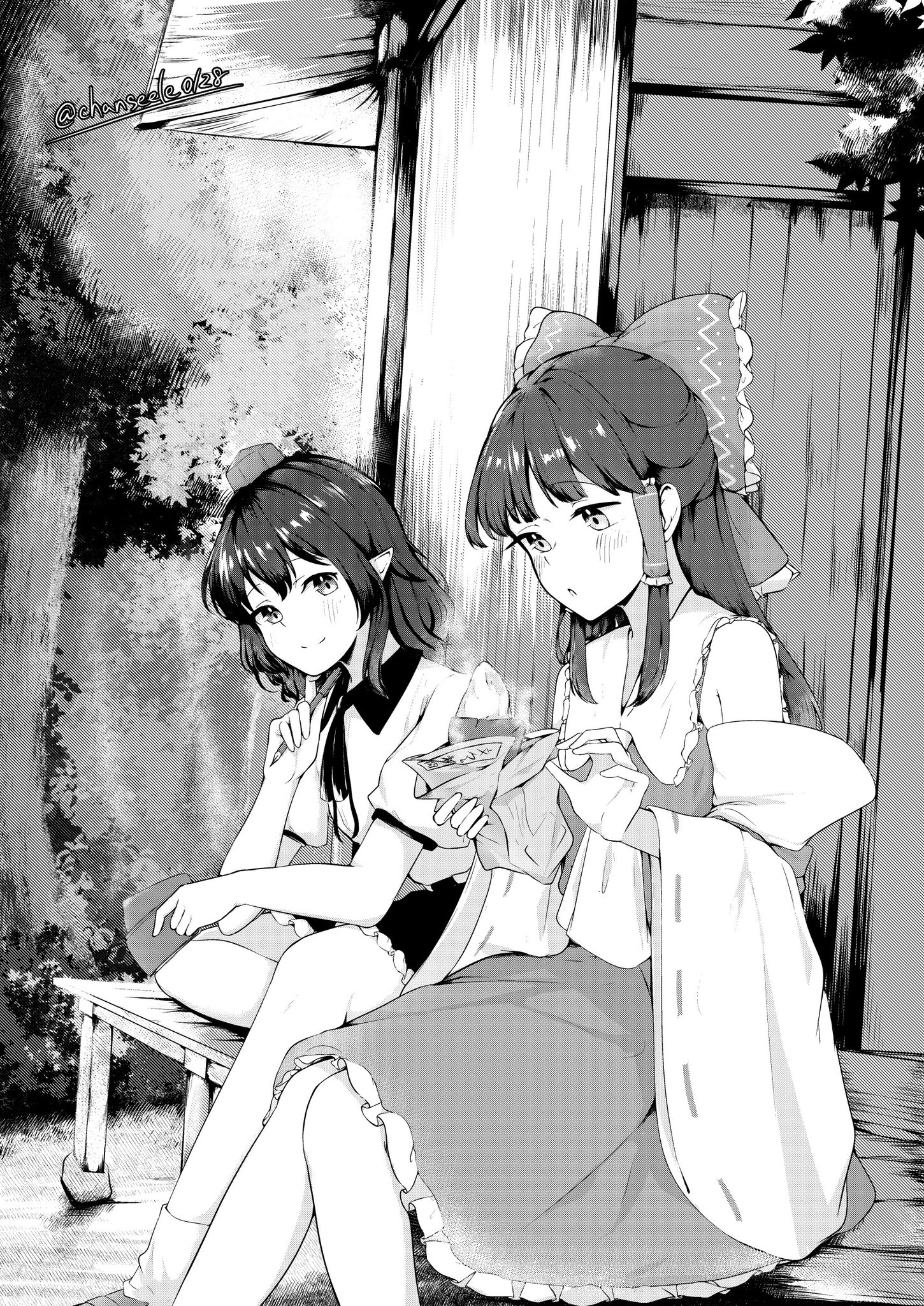 2girls ascot blush bow closed_mouth collared_shirt commentary_request detached_sleeves food frilled_bow frilled_hair_tubes frilled_skirt frills greyscale hair_bow hair_tubes hakurei_reimu hat highres holding holding_food long_hair monochrome multiple_girls neck_ribbon missing_wings open_mouth pointy_ears puffy_short_sleeves puffy_sleeves ribbon ribbon-trimmed_sleeves ribbon_trim seele_(chanseele0128) shameimaru_aya shirt short_sleeves sitting skirt smile steam tokin_hat touhou twitter_username