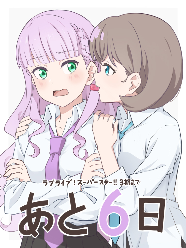 2girls blue_eyes blue_necktie blunt_bangs blush braid brown_hair collarbone collared_shirt commentary countdown crossed_arms dress_shirt eye_contact green_eyes half-closed_eyes hands_on_another's_shoulders laofuzi_dai_bansho long_hair long_sleeves looking_at_another love_live! love_live!_superstar!! mouth_hold multiple_girls necktie open_mouth purple_hair purple_necktie revision school_uniform shirt short_hair side_braids sleeves_past_wrists tang_keke teeth_hold translation_request upper_body very_long_hair wavy_hair white_background white_shirt wien_margarete yuri