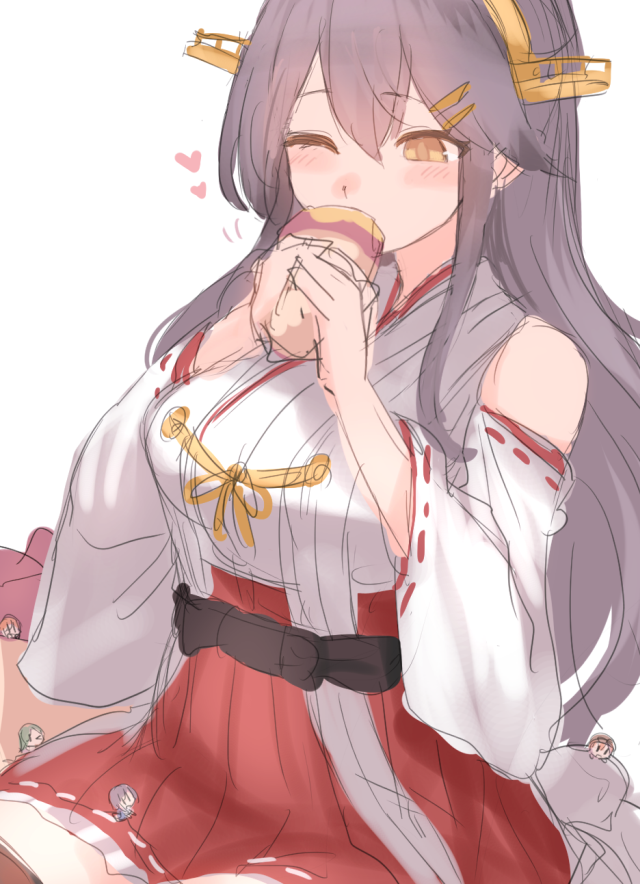 1girl black_hair brown_eyes cowboy_shot food hair_ornament hairclip hakama hakama_skirt haruna_(kancolle) headgear japanese_clothes kantai_collection long_hair nontraditional_miko one_eye_closed pleated_skirt red_skirt simple_background sitting skirt solo sweet_potato utopia_(utopiavl) white_background