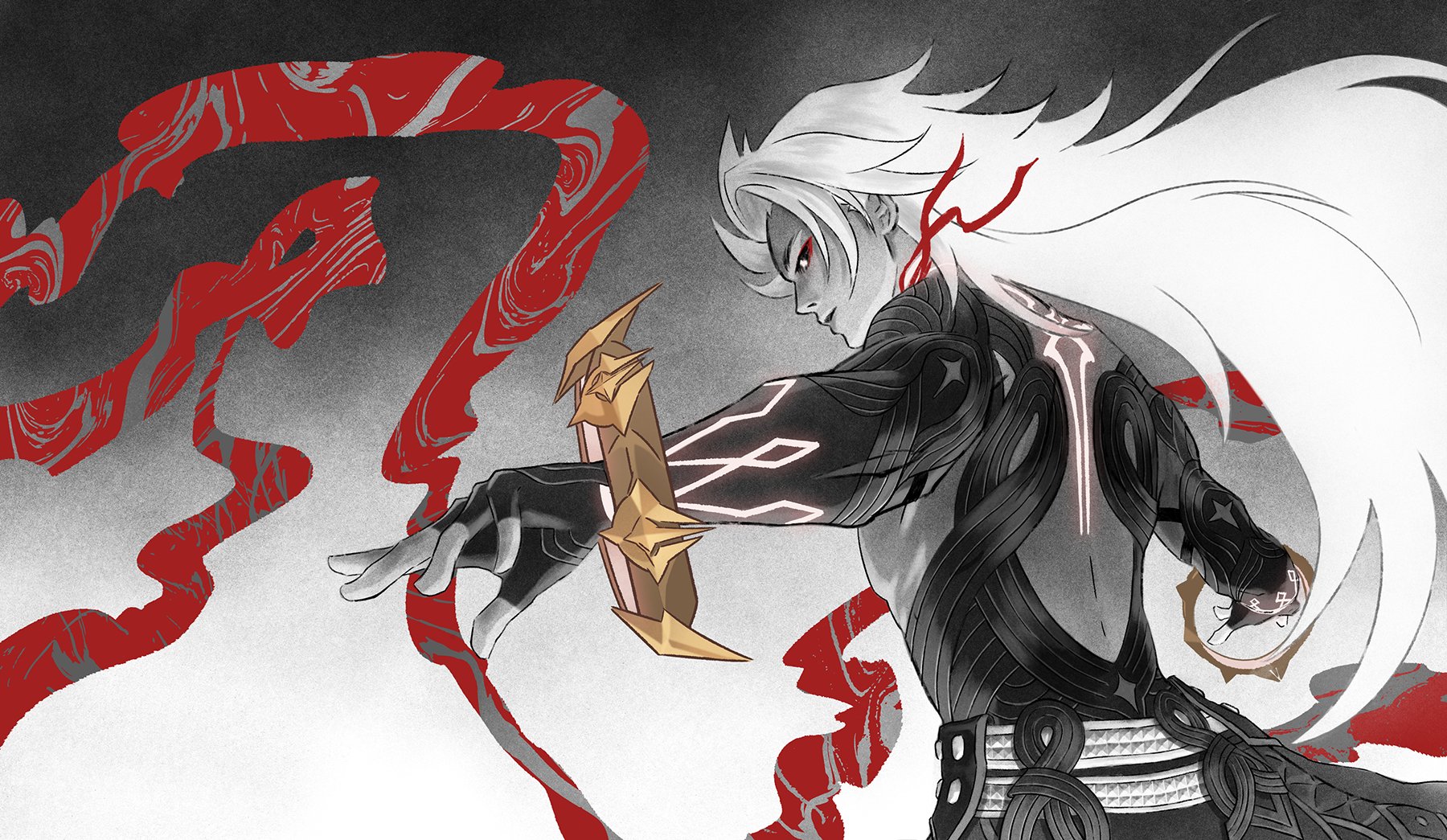 1boy black_gloves black_sclera bracelet colored_sclera colored_skin commentary dislyte english_commentary eyeshadow fingerless_gloves floating_hair from_behind gloves gold_bracelet grey_skin highres jewelry li_ling_(nezha) long_hair looking_back makeup male_focus mishie_chua official_alternate_design profile red_eyeshadow solo toned toned_male upper_body white_eyes white_hair