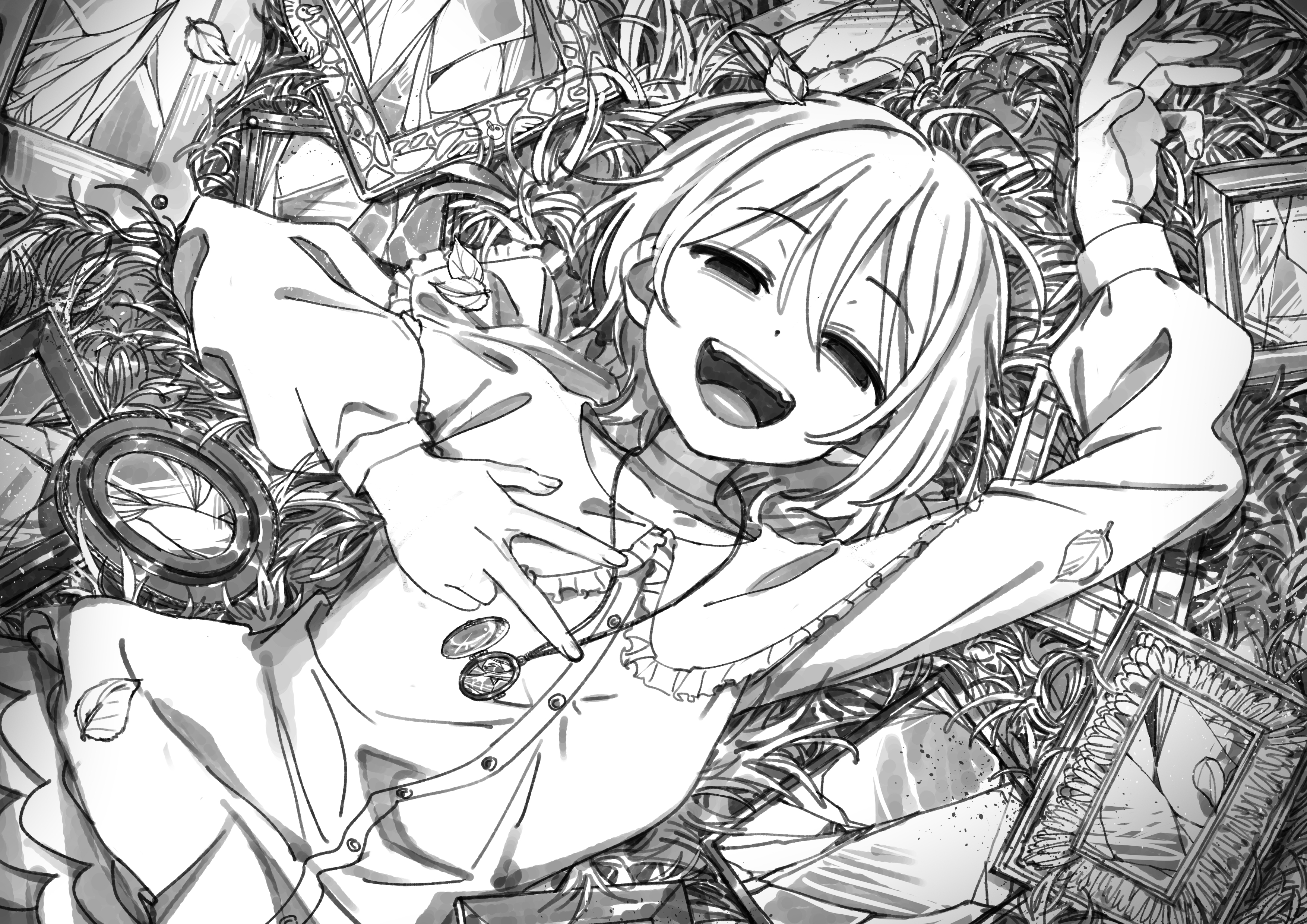 1girl :d absurdres arm_up broken_glass broken_picture_frame crazy danny_cho frills glass grass hair_between_eyes half-closed_eyes highres jewelry leaf locket looking_at_viewer lying on_back on_ground open_mouth original pendant picture_frame shirt smile solo v