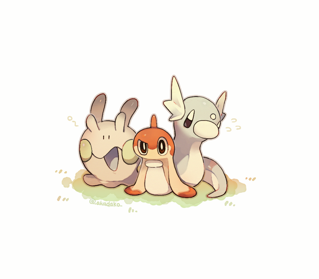 akadako animal_focus artist_name black_eyes bright_pupils closed_mouth commentary_request dratini fish flying_sweatdrops full_body gen_1_pokemon gen_6_pokemon goomy grass half-closed_eye looking_at_viewer nintendo no_humans open_mouth pokemon pokemon_(creature) simple_background tatsugiri tatsugiri_(curly) uneven_eyes white_background white_pupils