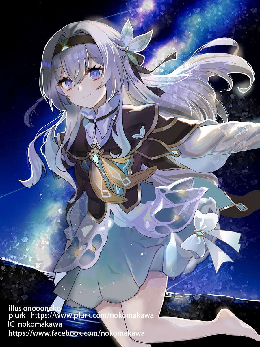 1girl barefoot black_jacket blue_dress blue_eyes closed_mouth commentary_request dress firefly_(honkai:_star_rail) grey_hair hair_between_eyes highres honkai:_star_rail honkai_(series) instagram_username jacket layered_sleeves long_hair long_sleeves lunacats shirt short_over_long_sleeves short_sleeves smile solo very_long_hair watermark web_address white_shirt