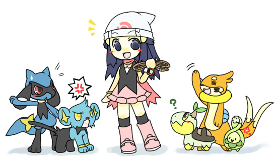 00s 1girl anger_vein black_hair blue_eyes blue_hair blush blush_stickers budew buizel dawn_(pokemon) gen_4_pokemon hair_ornament hairclip holding nintendo open_mouth parousa pokemon pokemon_diamond/pearl/platinum riolu rope scarf shinx sidelocks simple_background smile standing turtwig white_background
