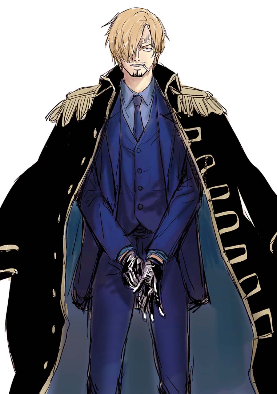 1boy adjusting_clothes black_coat black_gloves blue_jacket blue_necktie blue_suit blue_vest chief_(chiefvinsmoke) coat coat_on_shoulders collared_coat curly_eyebrows epaulettes facial_hair formal_clothes gloves goatee hair_over_one_eye highres jacket looking_at_viewer male_focus mustache_stubble necktie one_piece sanji_(one_piece) simple_background solo stubble suit vest white_background