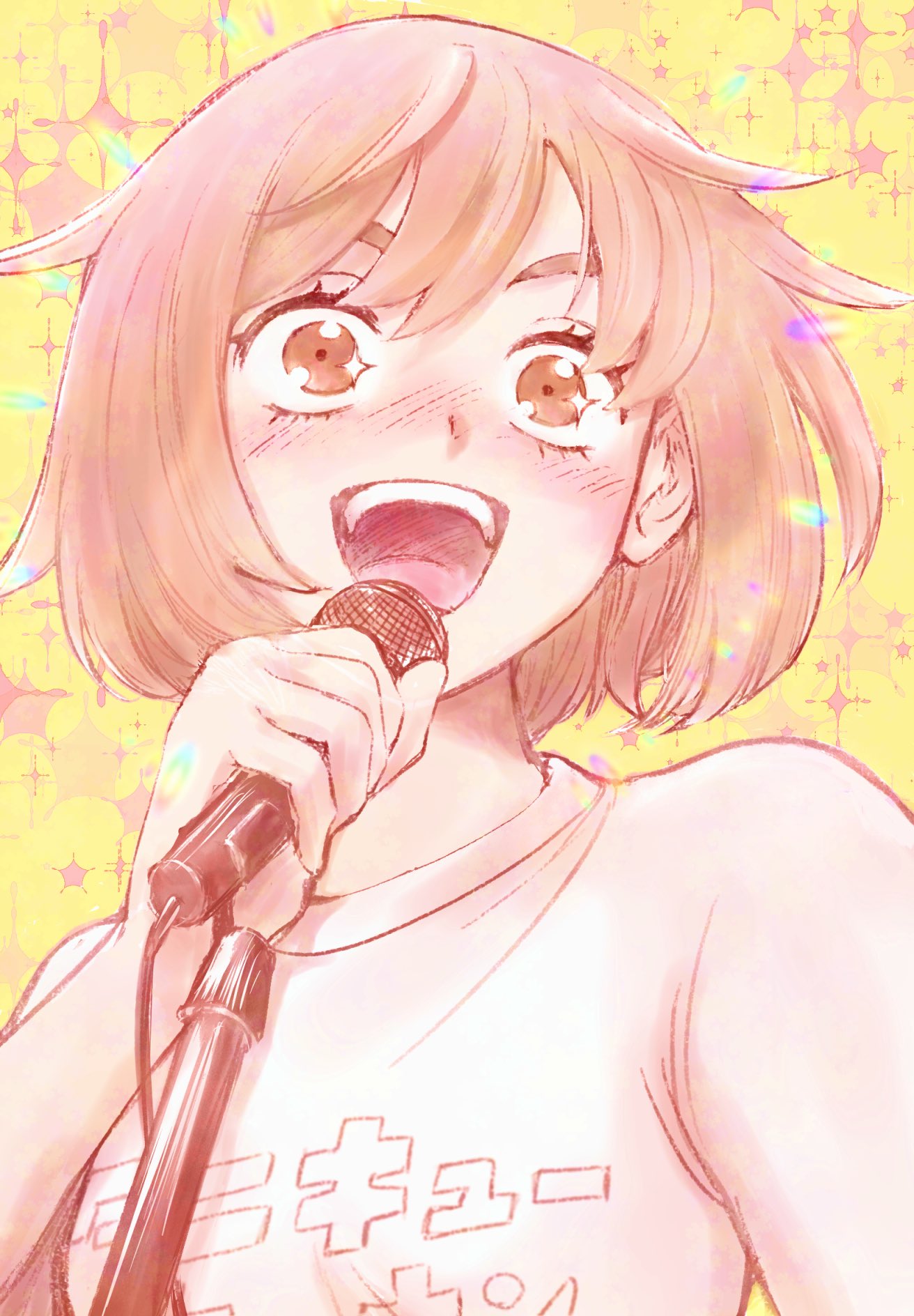 1girl blush bob_cut brown_eyes commentary_request futsuu_no_keion-bu goekakisan_(adelma) highres holding holding_microphone light_brown_hair microphone microphone_stand music nitta_tamaki open_mouth print_shirt shirt short_hair singing smile solo sparkle sparkling_eyes t-shirt teeth upper_body upper_teeth_only v-shaped_eyebrows white_shirt yellow_background