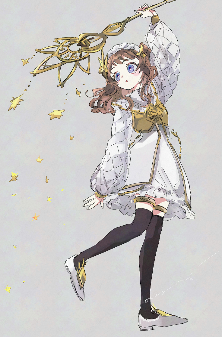 1girl :o alternate_costume arm_at_side arm_up black_thighhighs blue_eyes brown_hair commentary_request dress from_side full_body gakuen_idolmaster grey_background hairband hanami_saki holding holding_staff idolmaster jacket jewelry long_sleeves looking_back nega quilted_jacket short_dress simple_background solo staff star_(symbol) thighhighs thighlet walking white_dress white_hairband white_jacket