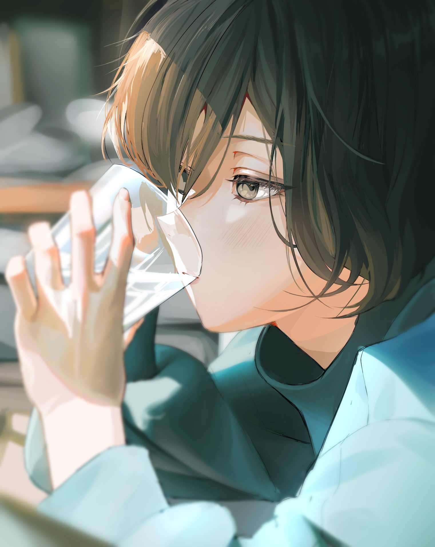1boy blurry blurry_background brown_eyes brown_hair cup drinking drinking_glass hair_over_one_eye highres holding holding_cup indoors long_sleeves luciel_(lucielellis) male_focus original short_hair solo sunlight sweater water