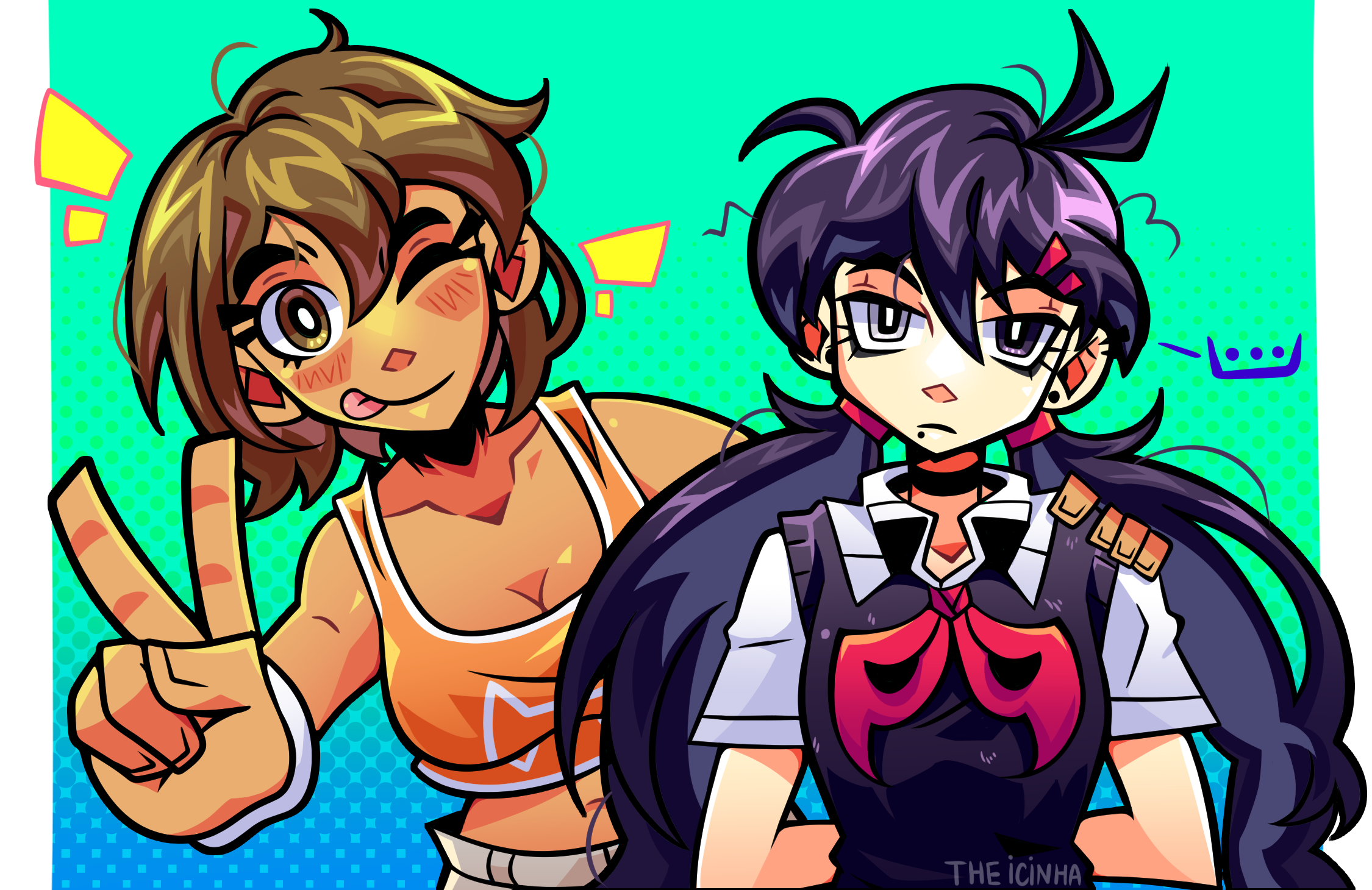 ... 2girls antenna_hair arms_behind_back artist_name black_choker black_eyes black_hair black_sweater_vest breasts bright_pupils brown_eyes brown_hair choker cleavage closed_mouth collarbone collared_shirt crop_top dark-skinned_female dark_skin genderswap genderswap_(mtf) grey_eyes hair_ornament hairclip heterochromia highres kel_(faraway)_(omori) kel_(omori) large_breasts long_hair looking_at_viewer low_twintails mole mole_under_mouth multiple_girls navel neckerchief omori red_neckerchief shirt short_hair short_sleeves speech_bubble spoilers spoken_ellipsis sunny_(omori) sweater_vest theicinha tongue tongue_out twintails v white_pupils white_shirt