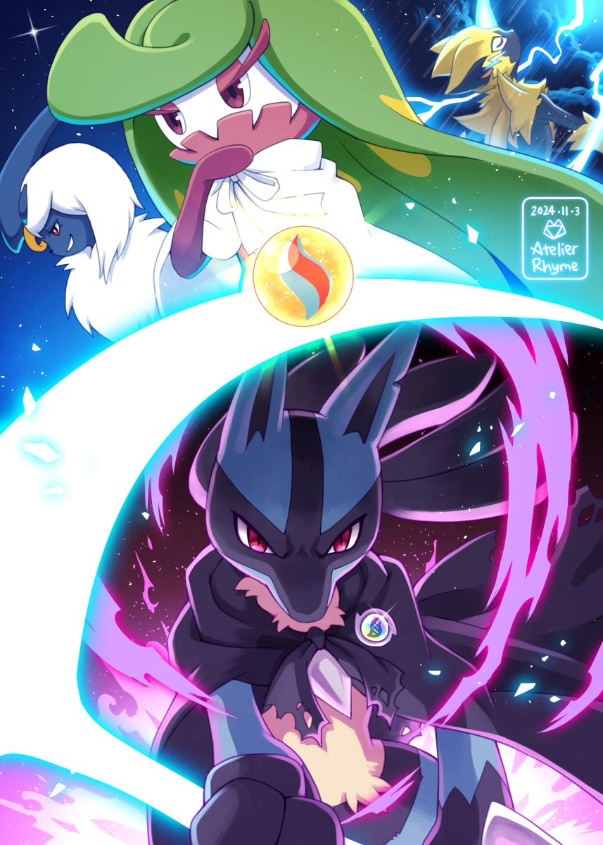 1girl 3others absol atelier_rhyme black_hair closed_eyes dated electricity furry gen_3_pokemon gen_4_pokemon gen_7_pokemon green_hair highres holding holding_scythe holding_weapon legendary_pokemon lucario mega_stone multiple_others mythical_pokemon nintendo pink_eyes pokemon pokemon_(creature) red_eyes scythe spikes tsareena weapon white_hair zeraora