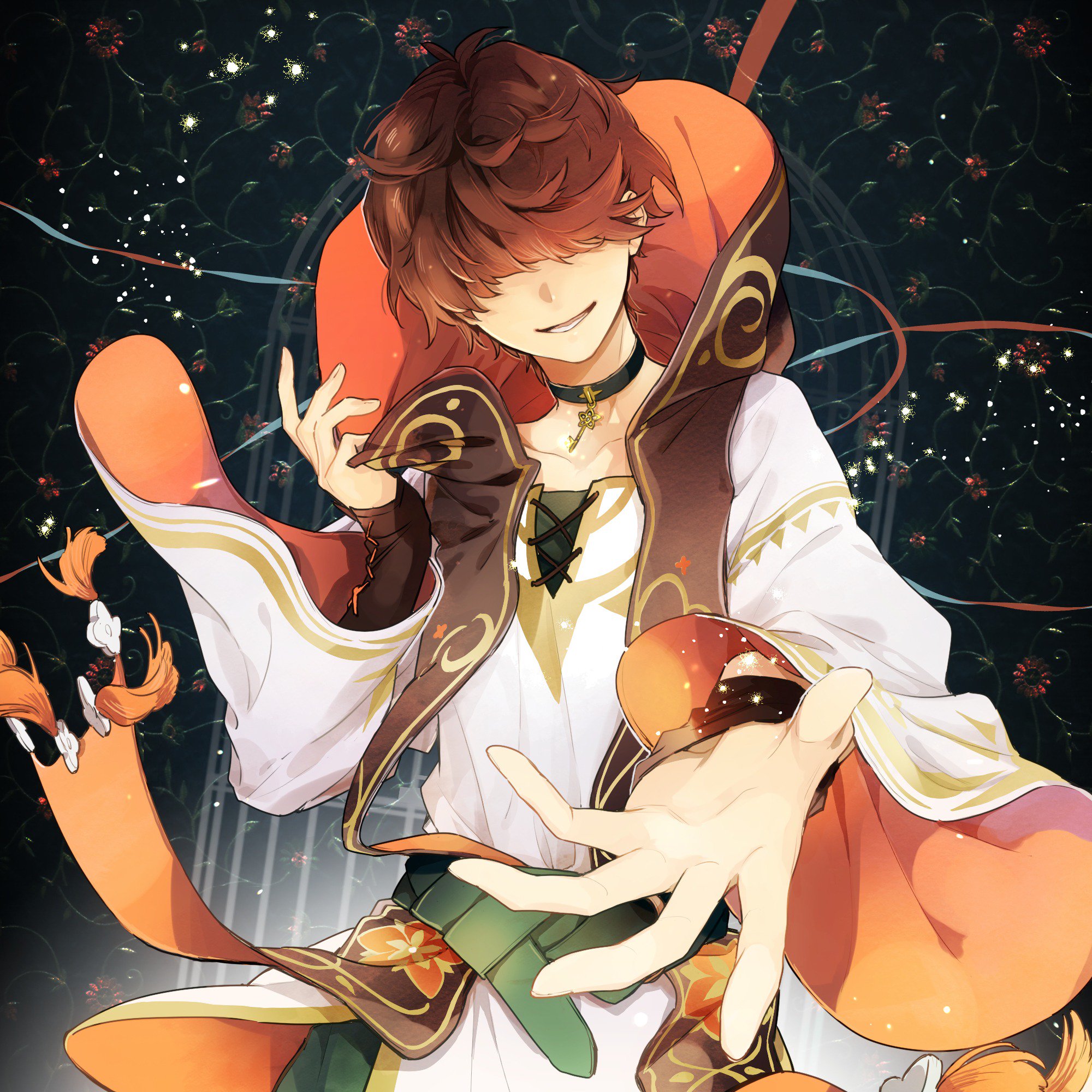 1boy aono_nachi birdcage brown_hair cage covered_eyes flower grimms_echoes guest_art highres jewelry joringel_(grimms_echoes) key key_necklace male_focus necklace open_mouth short_hair smile solo teeth