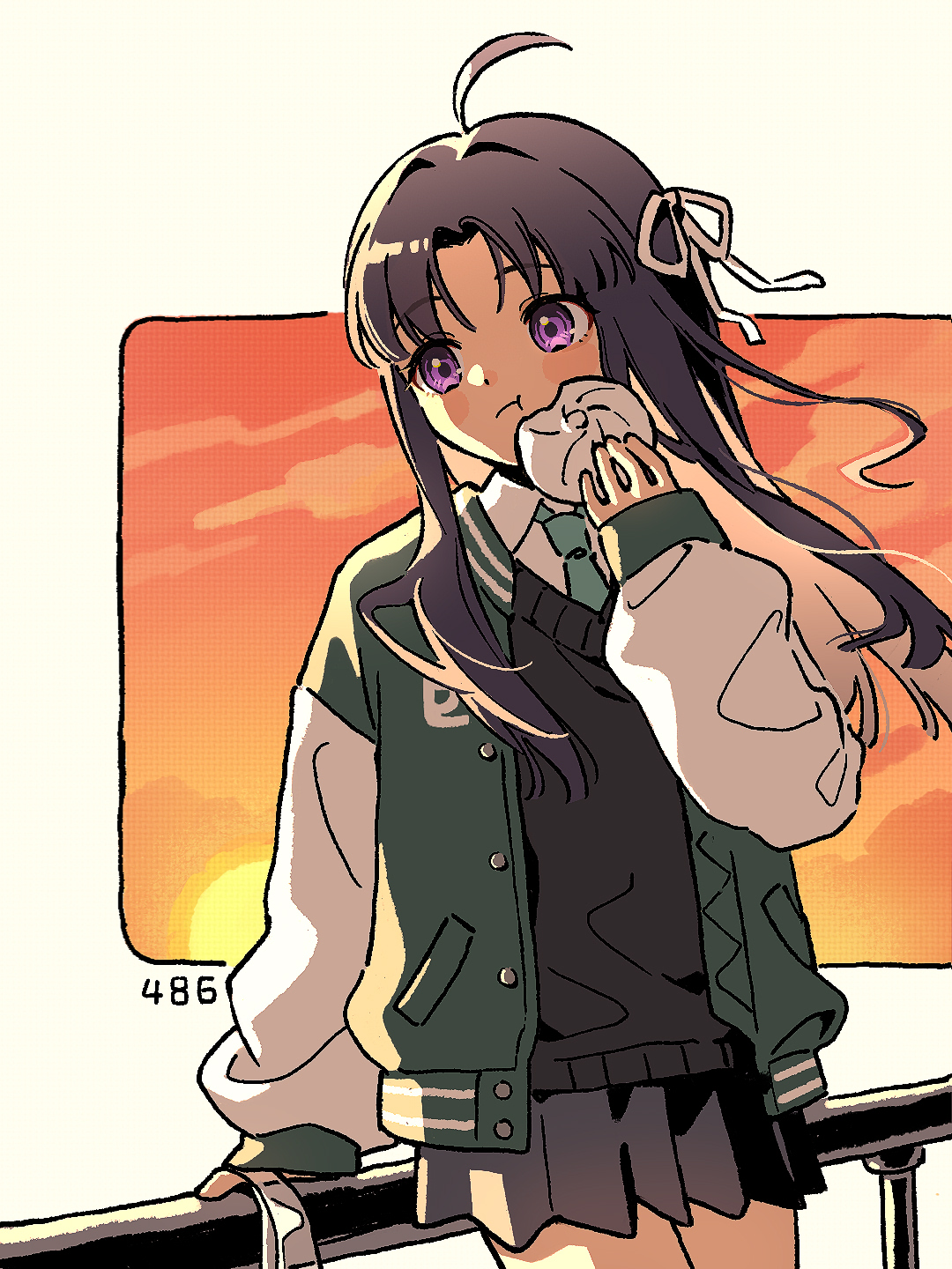 1girl against_railing ahoge awa_subaru steamed_bun black_hair black_sweater_vest blue_necktie blush closed_mouth collared_shirt commentary cowboy_shot eating floating_hair food girls_band_cry green_jacket grey_skirt hair_ribbon highres holding holding_food jacket long_hair long_sleeves necktie open_clothes open_jacket parted_bangs pleated_skirt purple_eyes railing ribbon shao_(shaorouhong) shirt sidelocks skirt sleeves_past_wrists solo sweater_vest white_ribbon white_shirt