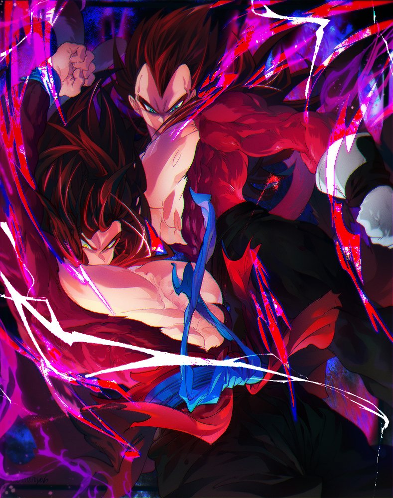 black_hair blue_sash closed_mouth dougi dragon_ball dragon_ball_heroes gloves long_hair male_focus monkey_boy monkey_tail multiple_boys muscular muscular_male ommmyoh pants red_fur saiyan sash son_goku son_goku_(xeno) spiked_hair super_full_power_saiyan_4_limit_breaker super_saiyan super_saiyan_4 tail time_patrol_(dragon_ball) twitter_username vegeta vegeta_(xeno)