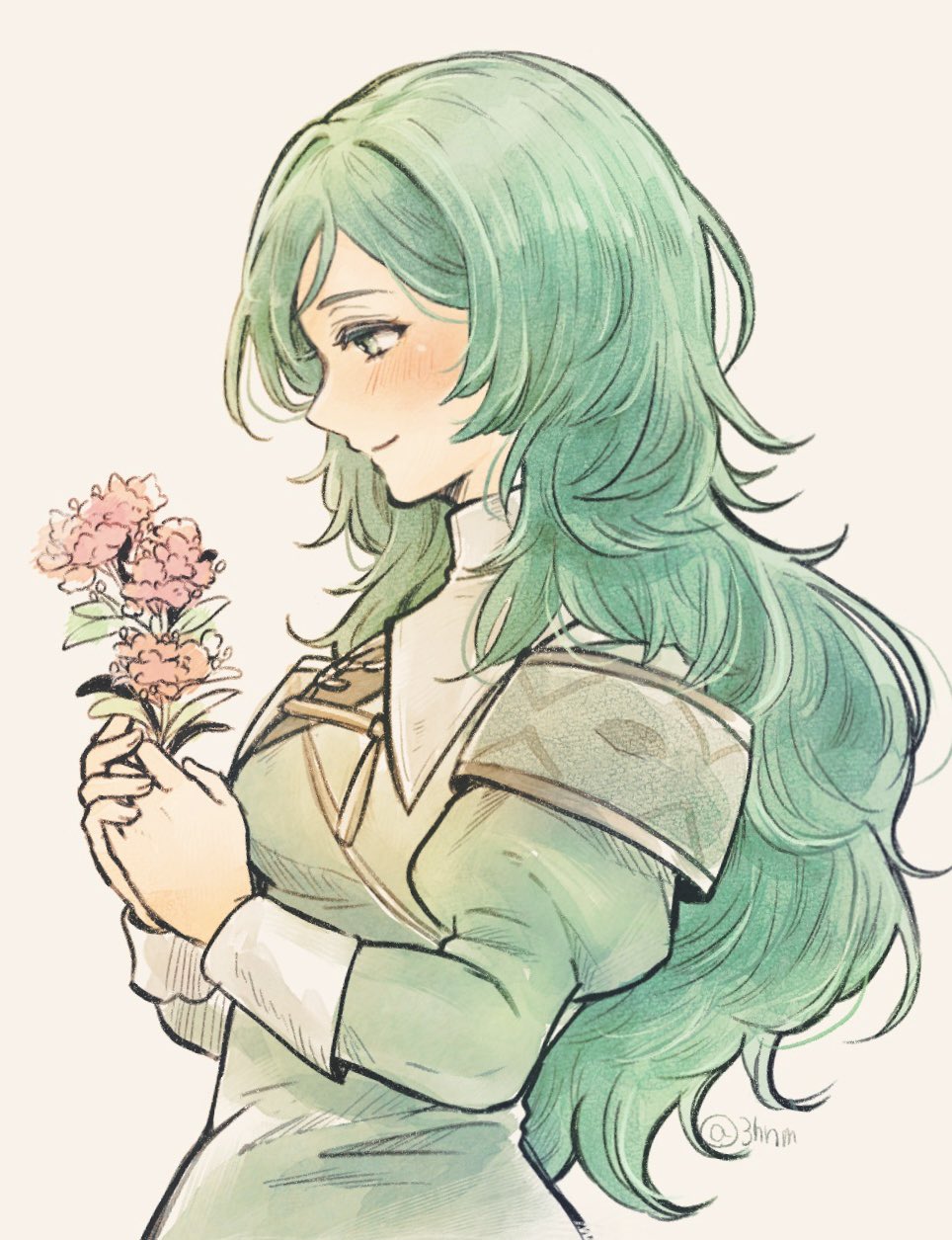 1girl 3hnmc closed_mouth commentary_request fire_emblem fire_emblem:_three_houses flower green_eyes highres holding holding_flower long_hair mature_female nintendo pink_flower simple_background sitri_eisner smile solo wavy_hair white_background