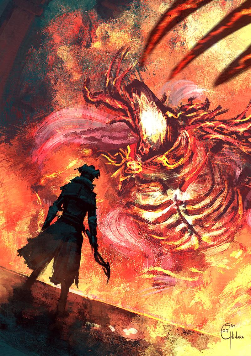 1other artist_name artofchinara blade_of_mercy bloodborne boss_fight claws commentary english_commentary fire from_behind full_body hat holding holding_weapon hunter_(bloodborne) laurence_the_first_vicar monster open_mouth ribs standing tricorne weapon