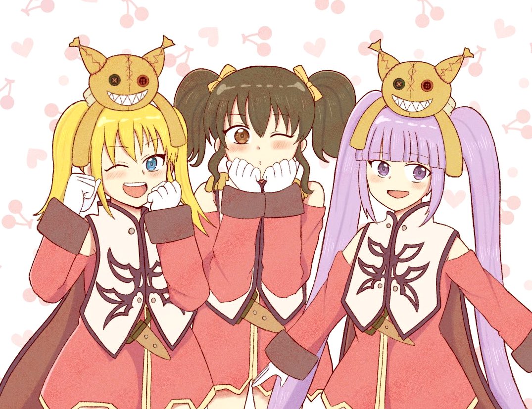 3girls :d anise_tatlin anise_tatlin_(cosplay) blonde_hair blue_eyes blush bow brown_eyes brown_hair commentary_request cosplay edna_(tales) gloves hair_bow in-franchise_crossover multiple_girls multiple_hair_bows one_eye_closed open_mouth purple_eyes purple_hair sleeves_past_wrists smile sophie_(tales) standing tales_of_(series) tales_of_graces tales_of_the_abyss tales_of_zestiria teeth tokunaga_(tales) twintails upper_teeth_only vefpeem white_gloves yellow_bow