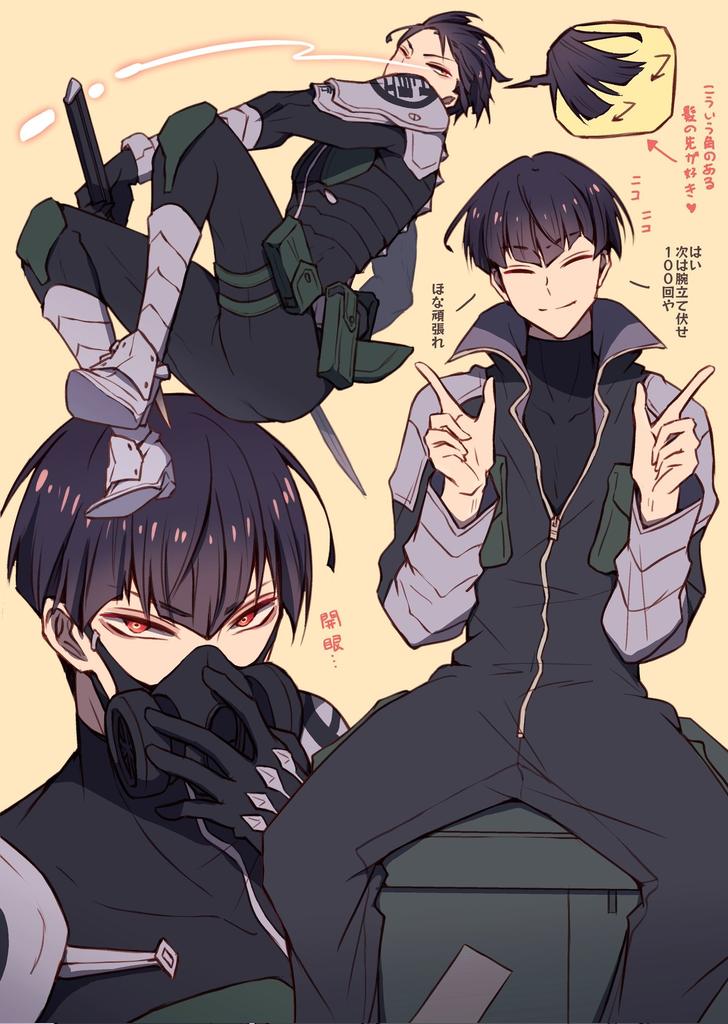 1boy black_hair bodysuit collage gas_mask gloves holding holding_sword holding_weapon hoshina_soshiro kaijuu_no._8 kariya_(kariya467801) long_sleeves male_focus mask multiple_views red_eyes sword weapon