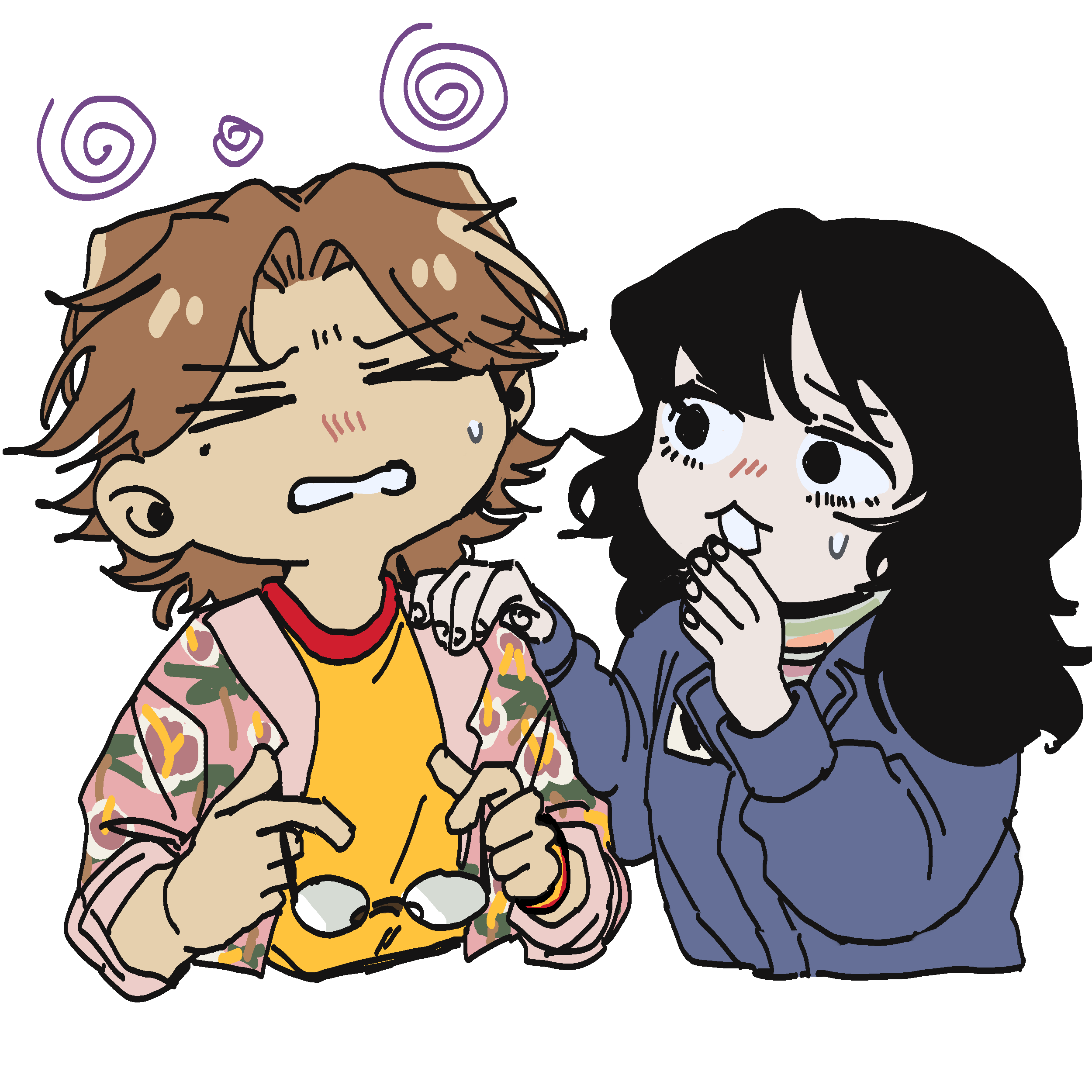 >_< 1boy 1girl absurdres anya_(mouthwashing) black_eyes black_hair blue_jumpsuit brown_hair chibi chibi_only cropped_torso daisuke_(mouthwashing) dizzy floral_print glasses highres holding holding_removed_eyewear jacket jumpsuit kashacroissant long_hair looking_at_another mole mole_under_eye mouthwashing pink_jacket shirt simple_background spiral sweatdrop unworn_eyewear white_background yellow_shirt