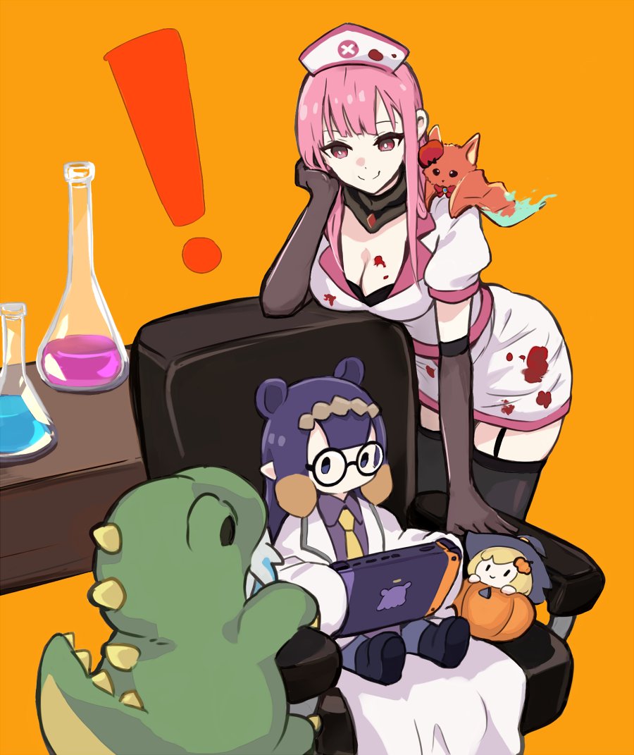 ! 5girls beaker beret blonde_hair blood blood_on_breasts blood_on_clothes breasts bright_pupils c: cat chibi cleavage commentary dinosaur_costume elbow_gloves gawr_gura glasses gloves hat hololive hololive_english holomyth large_breasts long_hair mori_calliope multiple_girls ninomae_ina'nis nurse nurse_cap official_alternate_costume orange_hair pink_hair pointy_ears pumpkin purple_hair simple_background smile smol_ame untranslatable_commentary takanashi_kiara virtual_youtuber watson_amelia white_pupils witch_hat yellow_background yuuyu_(777)