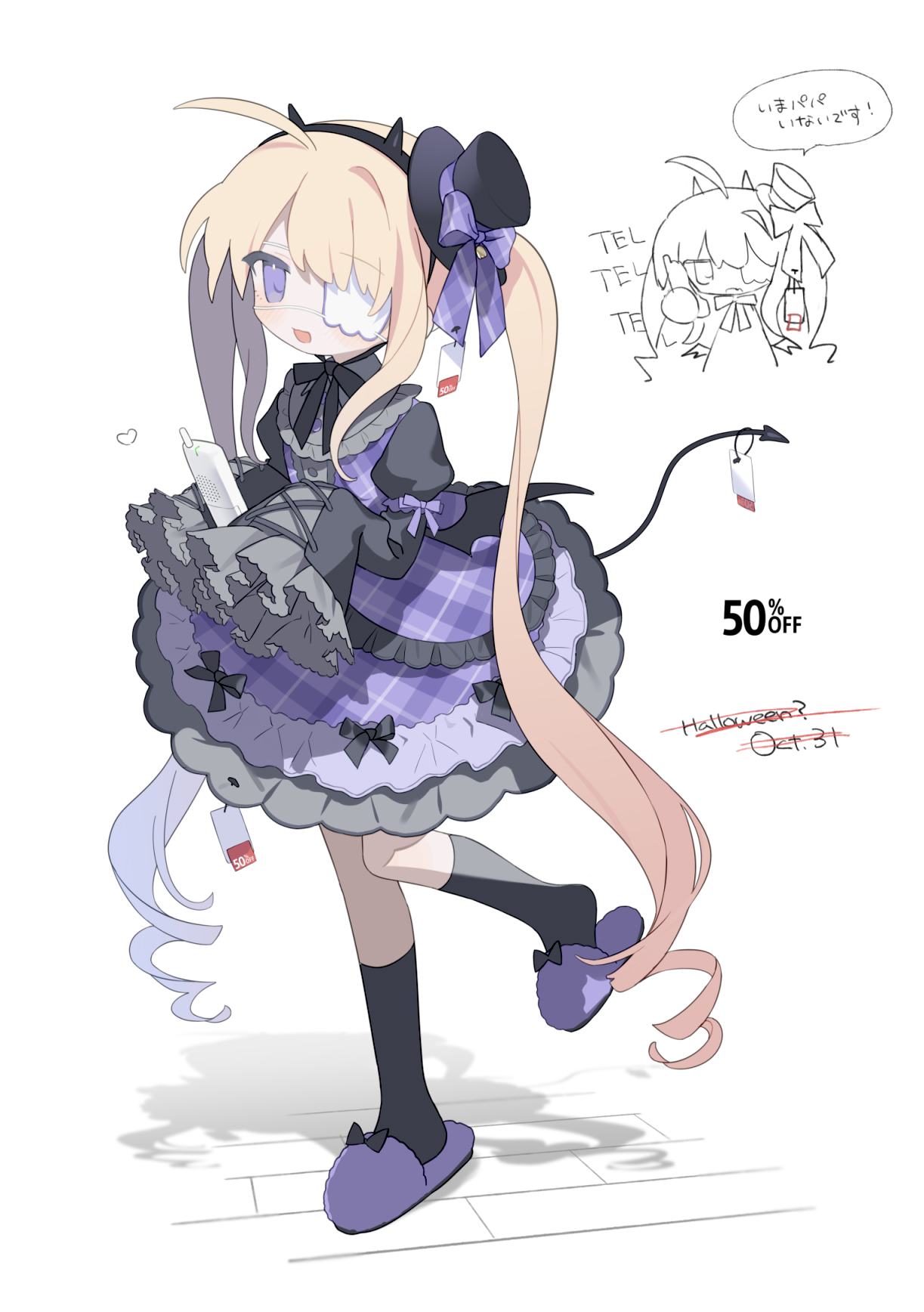 1girl ahoge black_socks blonde_hair daizu_(melon-lemon) demon_tail demon_wings dress eyepatch fake_horns frilled_dress frills full_body hat hat_ribbon highres holding holding_phone horns long_hair long_sleeves looking_at_viewer low_wings medical_eyepatch mini_hat mini_top_hat mini_wings one_eye_covered open_mouth original phone plaid_clothes plaid_dress plaid_ribbon price_tag purple_dress purple_eyes purple_ribbon purple_slippers ribbon sale short_dress sleeves_past_fingers sleeves_past_wrists slippers socks solo standing standing_on_one_leg tail top_hat twintails very_long_hair white_background wings