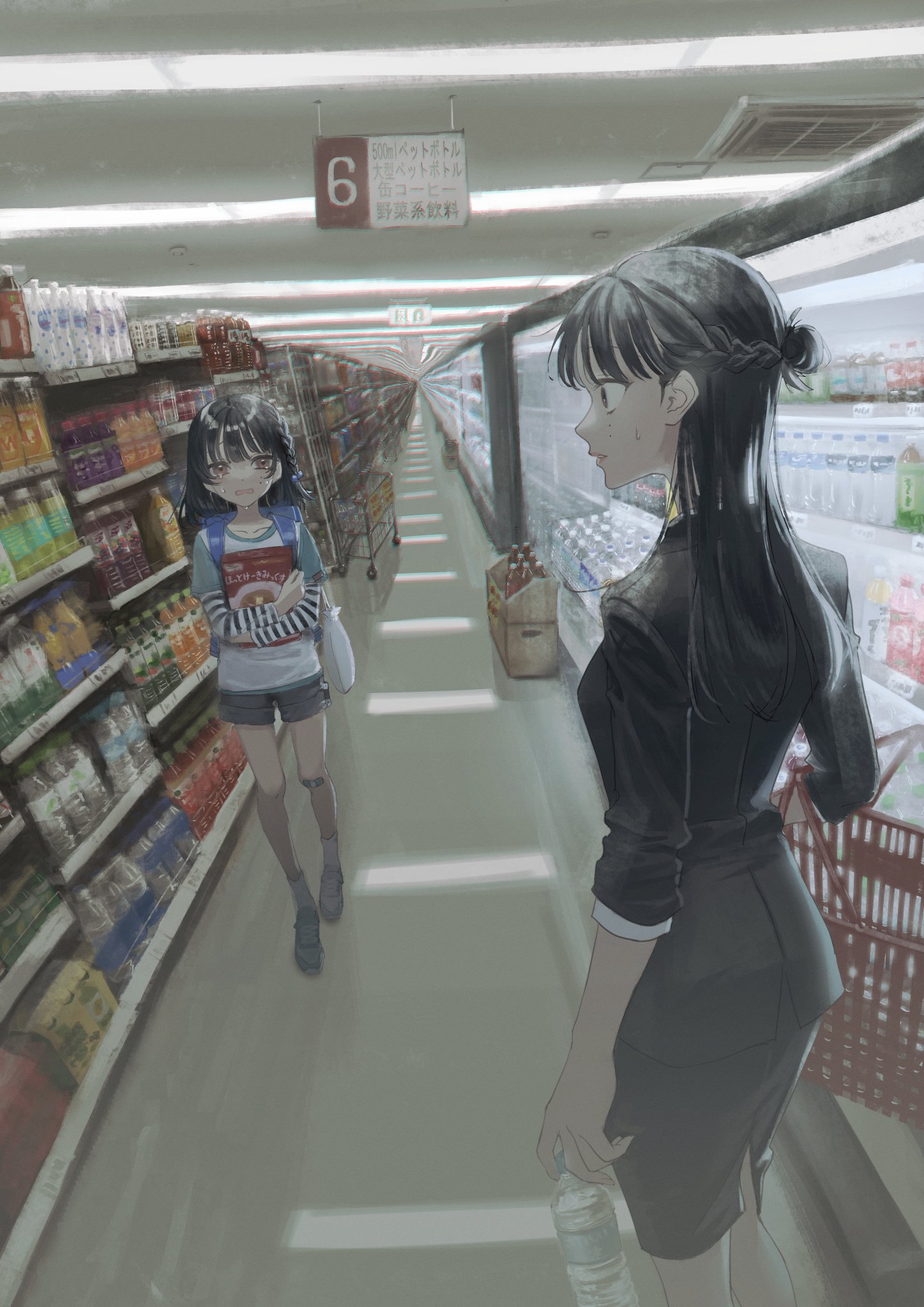 2girls backpack bag bandaid bandaid_on_knee bandaid_on_leg black_hair blue_bag bottle braid ceiling_light crying crying_with_eyes_open hair_bobbles hair_bun hair_ornament half_up_braid half_updo highres holding indoors layered_sleeves lips long_hair long_sleeves mole mole_on_cheek mother_and_child mother_and_daughter multiple_girls original otonashi00002 parent_and_child parted_lips pencil_skirt randoseru reflective_floor shopping shopping_basket short_over_long_sleeves short_shorts short_sleeves shorts side_braid skirt standing striped_sleeves supermarket tears vanishing_point