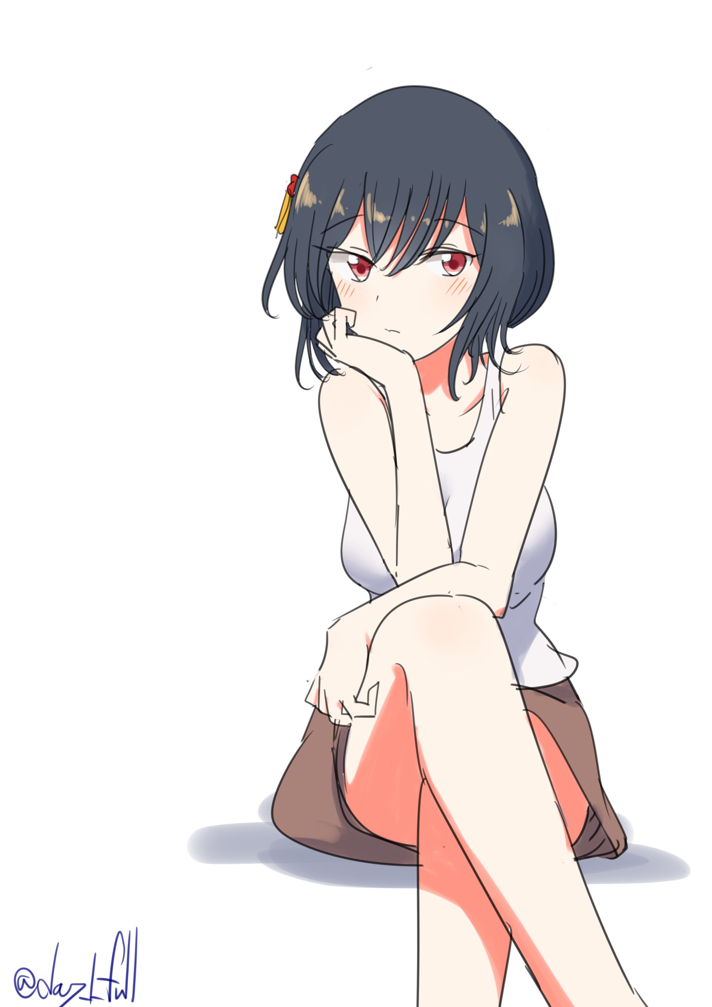 1girl absurdres alternate_costume black_hair brown_skirt crossed_legs feet_out_of_frame hand_on_own_chin highres kantai_collection one-hour_drawing_challenge red_eyes robinson_(day_l_full) short_hair simple_background skirt solo tank_top twitter_username white_background white_tank_top yamashiro_(kancolle)