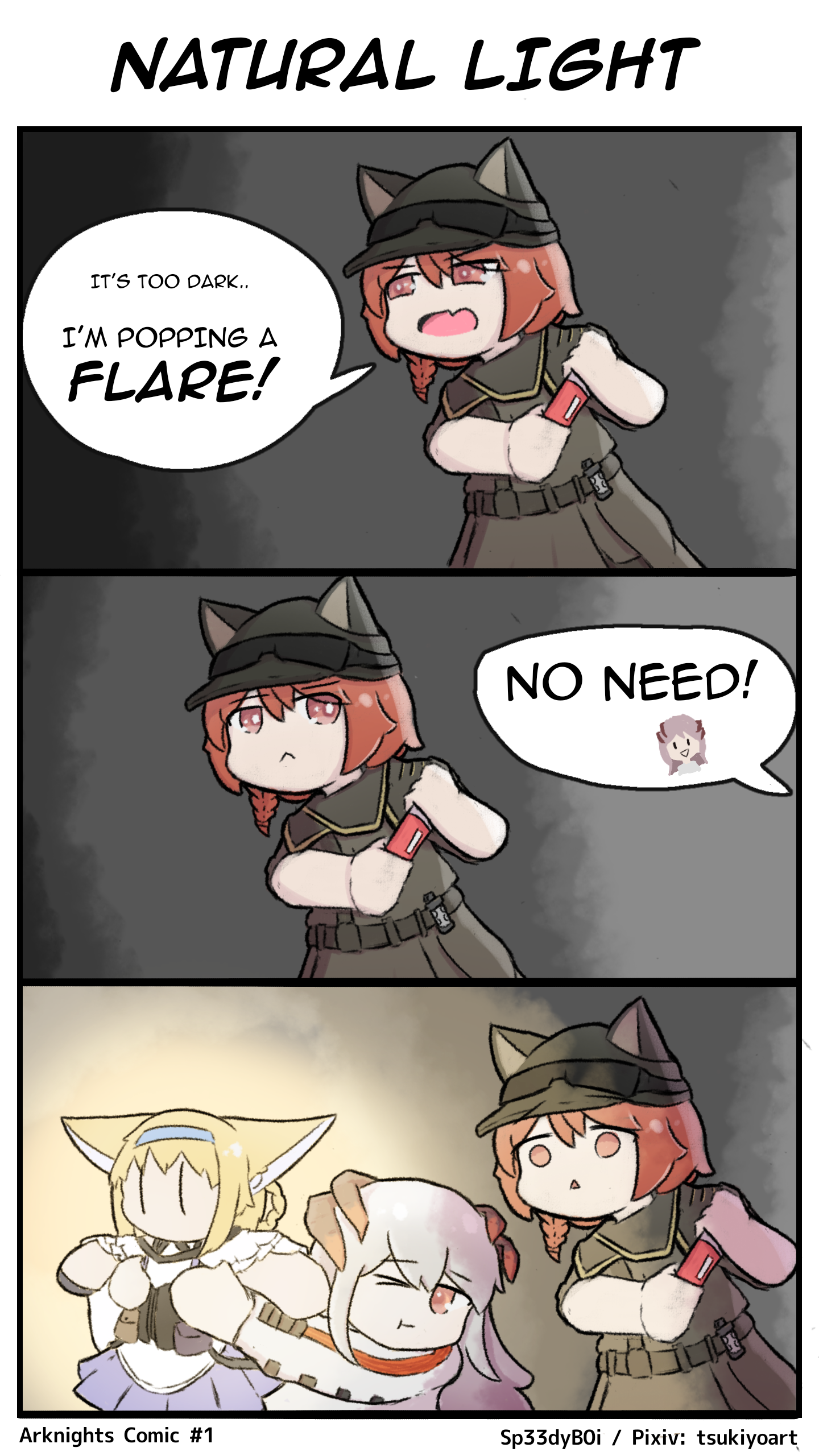 3girls absurdres animal_ear_headwear animal_ears arknights artist_name ash_(rainbow_six_siege) baseball_cap blue_hairband commentary crossover dress english_commentary english_text fake_animal_ears grey_hair hair_rings hairband hat highres holding horns lifting_person long_hair looking_at_another multiple_girls one_eye_closed open_mouth pixiv_username rainbow_six_siege red_eyes saria_(arknights) speech_bubble speedyb0i suzuran_(arknights) upper_body