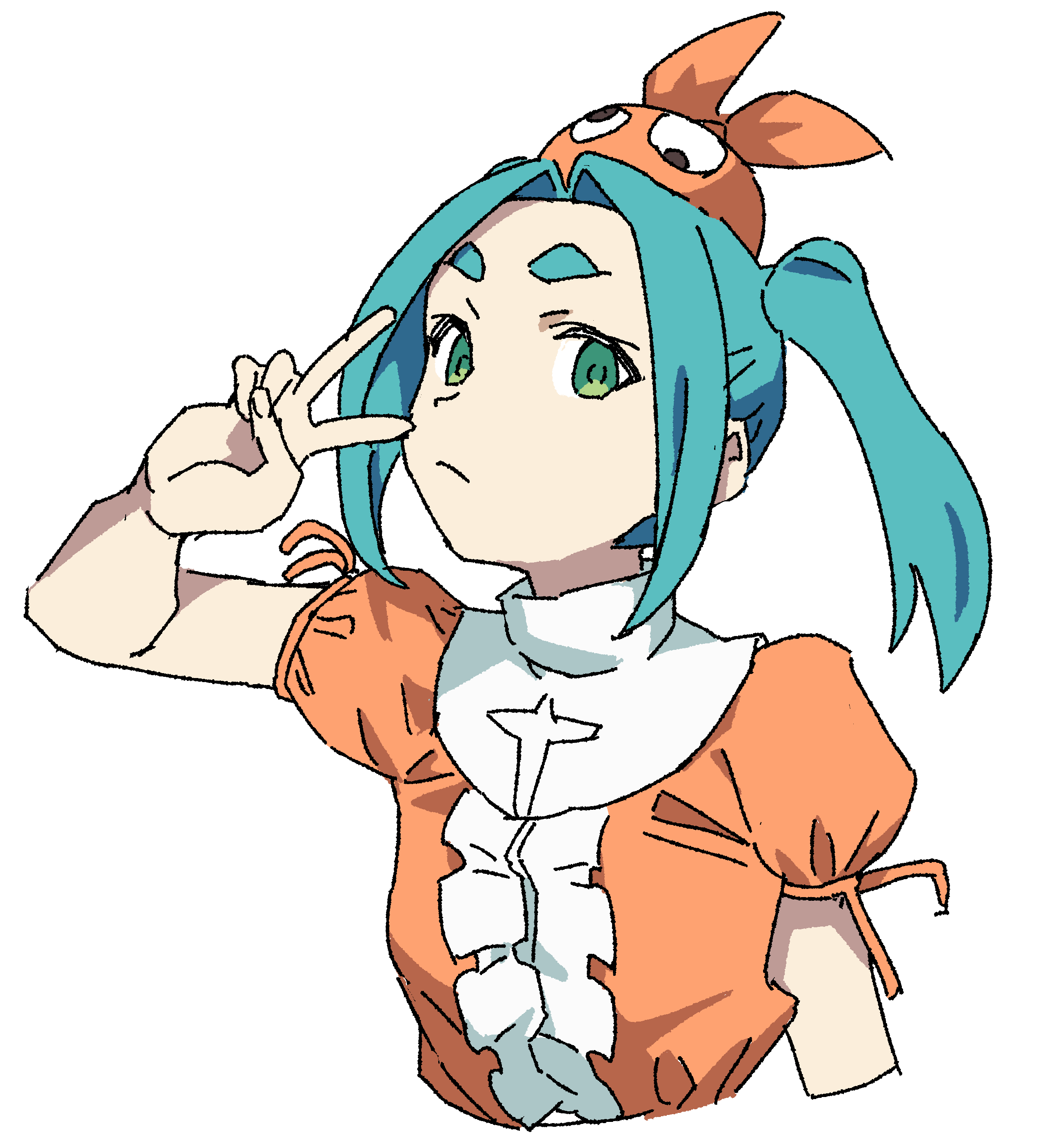 1girl absurdres aqua_hair center_frills closed_mouth cropped_arm cropped_arms cropped_torso expressionless frills googly_eyes green_eyes hat highres looking_at_viewer medium_hair momo_no_suidou-sui monogatari_(series) ononoki_yotsugi orange_hat orange_shirt puffy_short_sleeves puffy_sleeves shirt short_sleeves sidelocks simple_background solo thick_eyebrows twintails upper_body v v_over_eye white_background