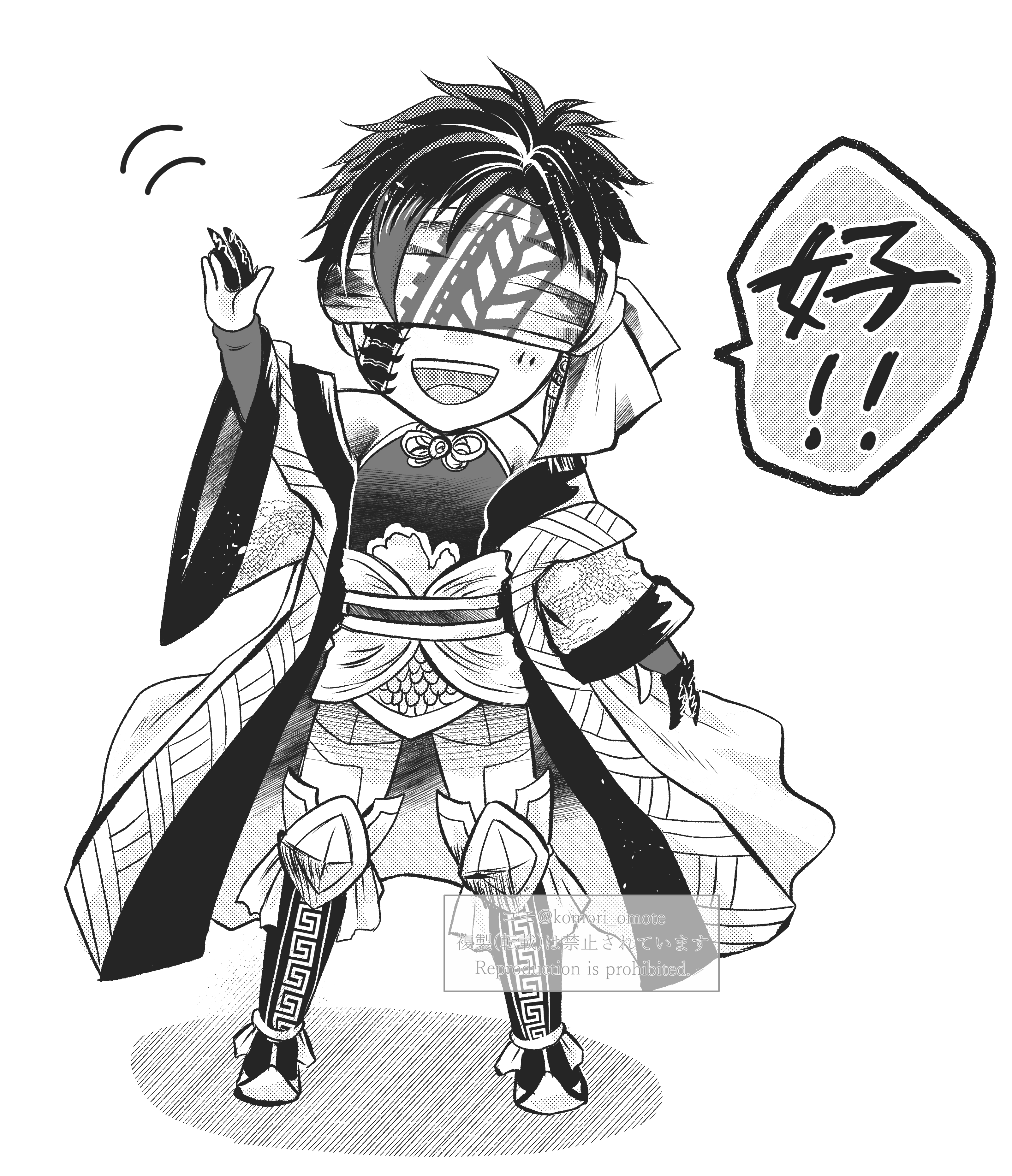 1boy absurdres arm_up armor bare_shoulders blindfold blush boots centipede_tattoo cheek_tattoo chinese_clothes earrings facial_tattoo gloves highres japanese_text jewelry knee_pads male_focus motion_lines nail_armor obi off-shoulder_robe off_shoulder open_mouth pants partially_fingerless_gloves qin_shi_huang_(shuumatsu_no_valkyrie) robe sash short_hair shuumatsu_no_valkyrie single_earring sleeveless smile solo speech_bubble standing tassel tassel_earrings tattoo teeth upper_teeth_only waving