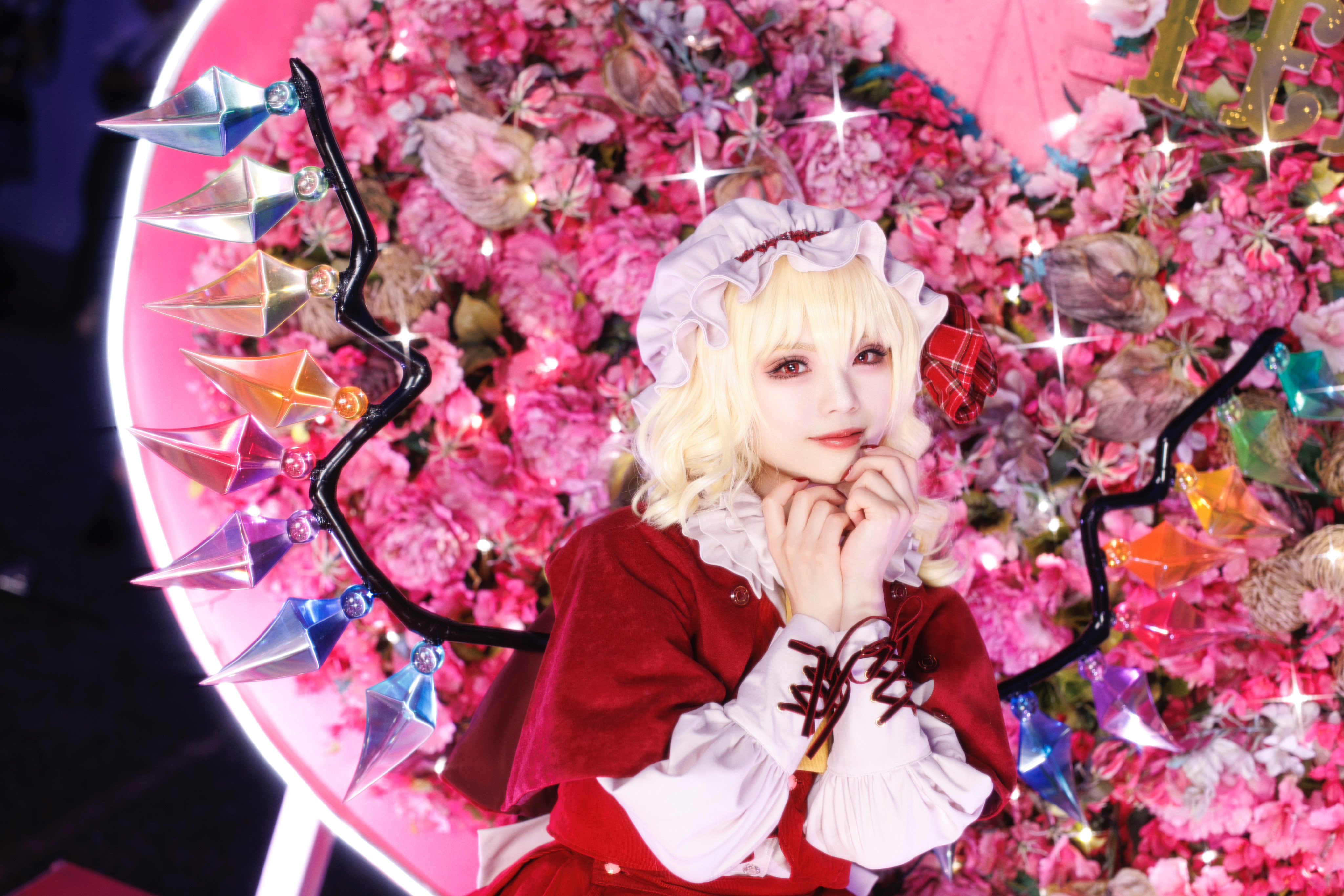 1girl absurdres adapted_costume blonde_hair capelet closed_mouth cosplay_photo crystal flandre_scarlet floral_background flower hat highres light_smile long_sleeves looking_at_viewer medium_hair mob_cap multicolored_wings nail_polish photo_(medium) pink_flower red_capelet red_eyes red_nails red_skirt red_vest shio_koworo shirt skirt solo touhou upper_body vest white_hat white_shirt wings