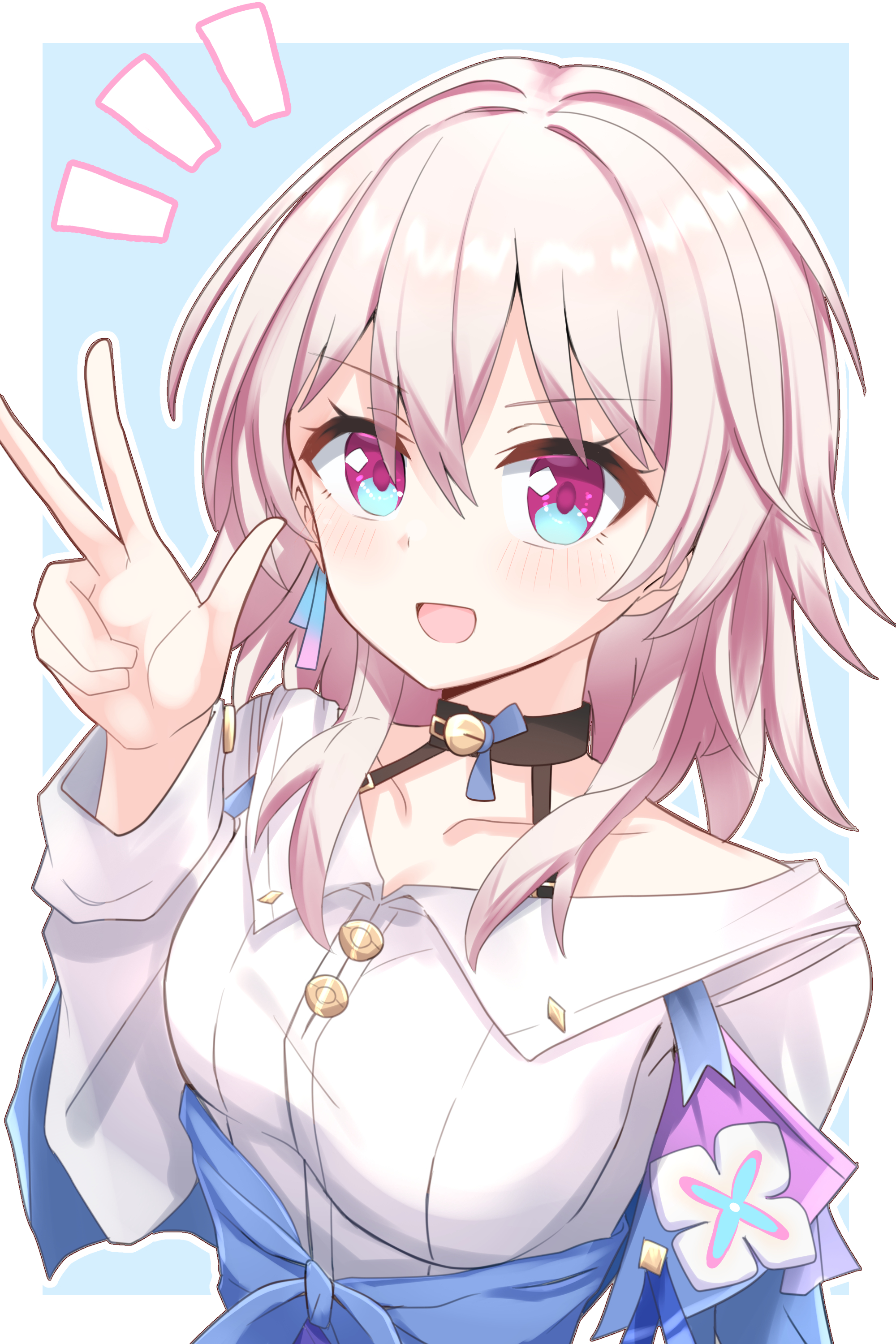 1girl absurdres black_choker blue_background blue_eyes blue_jacket border breasts choker commentary_request earrings hair_between_eyes hand_up highres honkai:_star_rail honkai_(series) jacket jewelry keemaru_(k_maru1022holo) long_sleeves looking_at_viewer march_7th_(honkai:_star_rail) march_7th_(preservation)_(honkai:_star_rail) medium_breasts medium_hair multicolored_eyes open_mouth outside_border pink_eyes pink_hair shirt simple_background single_earring solo tied_jacket two-tone_eyes upper_body v white_border white_shirt