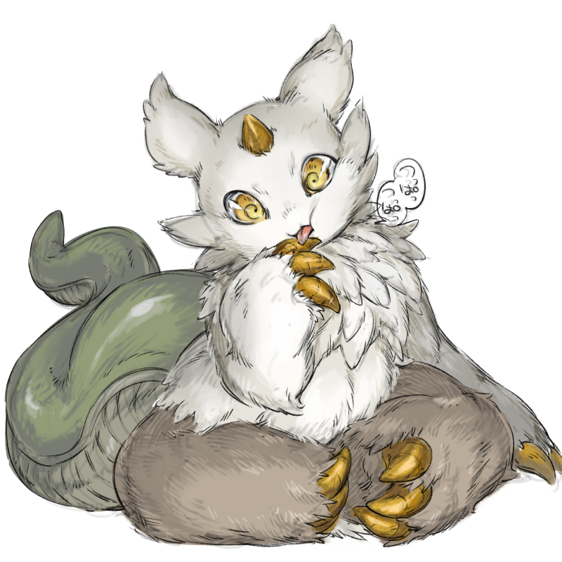 anoko_(chiikawa) chiikawa creature creature_focus full_body horns licking licking_hand no_humans simple_background single_horn sitting solo tongue tongue_out translation_request transpot_nonoko white_background yellow_eyes