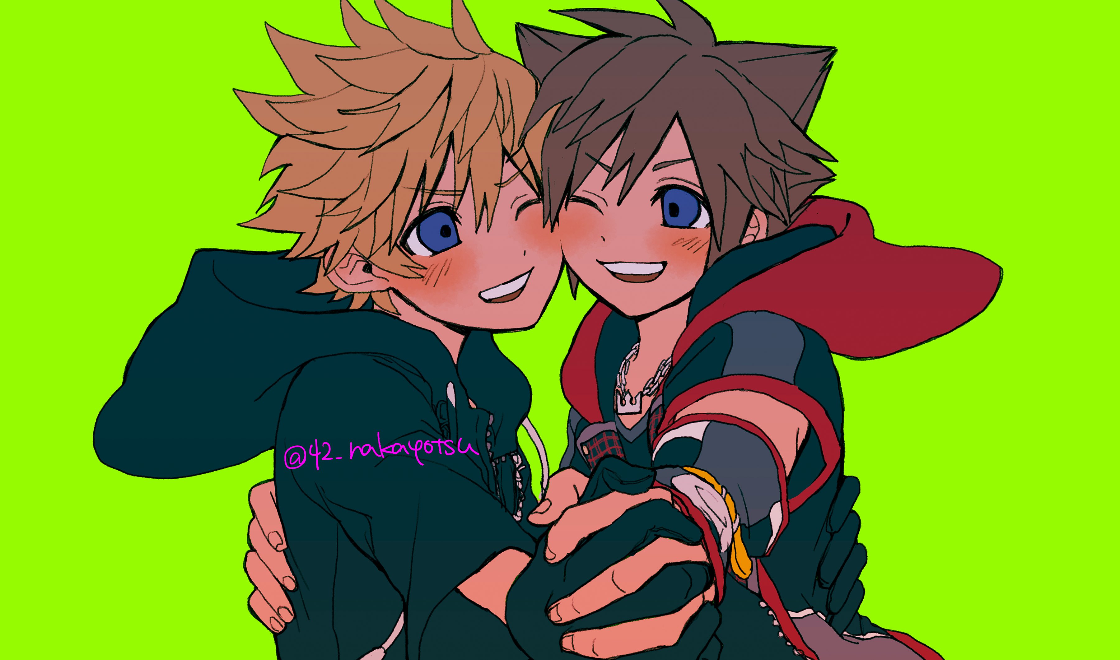2boys 42_nakayotsu absurdres black_coat_(kingdom_hearts) black_gloves blonde_hair blue_eyes blush brown_hair chain chain_necklace crown_(symbol) crown_necklace gloves happy highres holding holding_hands hood jacket jewelry kingdom_hearts kingdom_hearts_iii male_focus multiple_boys necklace open_mouth roxas short_hair smile sora_(kingdom_hearts) spiked_hair twitter_username