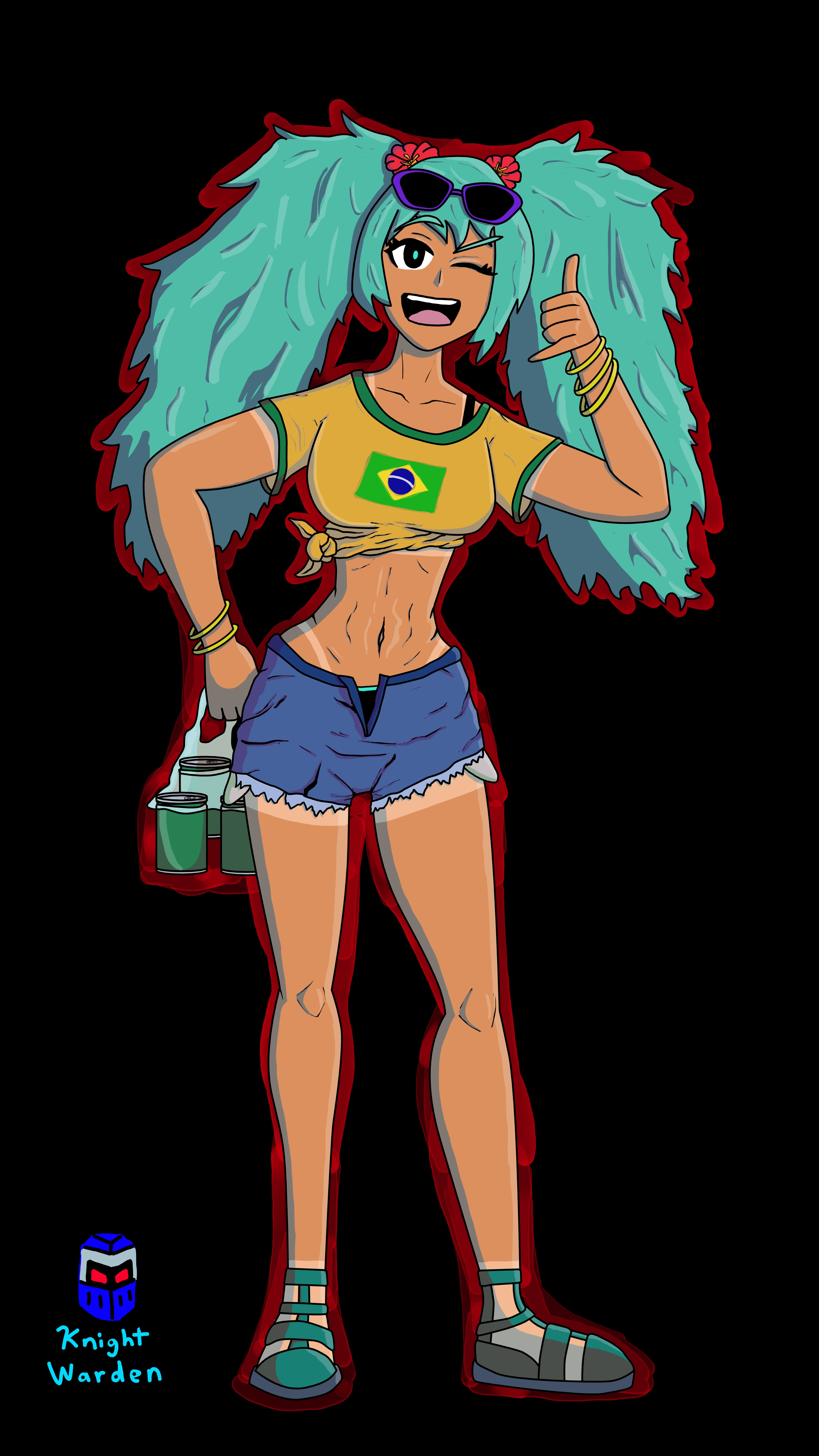 1girl absurdres black_background black_bra black_underwear_(female) blue_hair bra bracelet brazil brazilian_flag brazilian_miku can denim denim_shorts drink_can flower hand_on_own_hip happy hatsune_miku highres jewelry knight_warden kw_artz messy_hair one_eye_closed red_flower sandals shirt shorts smile soda_can sunglasses sunglasses_on_head tan tank_top tanline tied_shirt twintails underwear wink yellow_shirt
