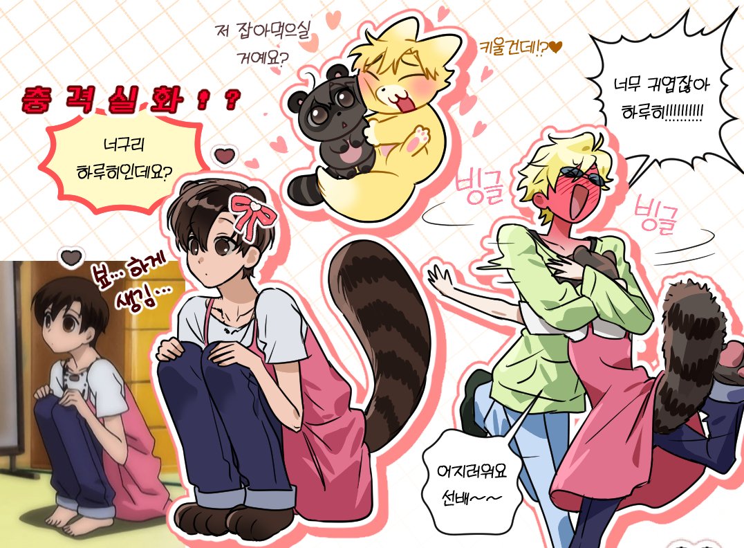 17_00 1boy 1girl animal animal_ears animal_feet animalization apron blonde_hair blush brown_eyes brown_hair commentary_request fox fujioka_haruhi full-face_blush green_hoodie hetero hood hoodie hug korean_commentary korean_text monster_girl monsterification ouran_high_school_host_club pink_apron raccoon raccoon_ears raccoon_girl raccoon_tail short_hair spinning squatting standing standing_on_one_leg suou_tamaki tail translation_request
