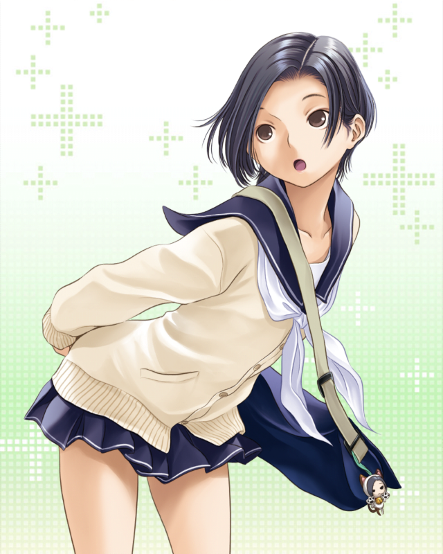 1girl asymmetrical_bangs asymmetrical_hair bag bag_charm black_hair black_sailor_collar black_skirt blue_bag bob_cut breasts brown_eyes cardigan charm_(object) forehead green_background hand_on_own_hip kobayakawa_rinko leaning_forward long_sleeves love_plus miniskirt neckerchief official_art open_mouth parted_bangs pleated_skirt plus_sign sailor_collar school_bag school_uniform serafuku short_hair shoulder_bag skirt small_breasts solo standing two-tone_background upper_body white_background white_neckerchief