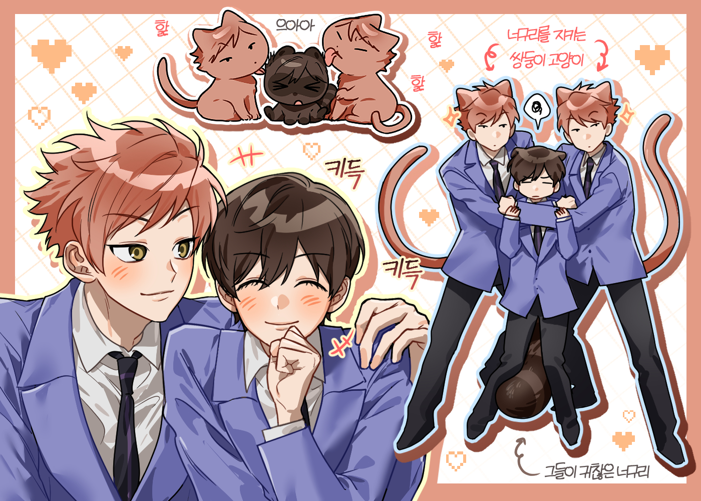 17_00 1girl 2boys animal animal_ears animalization argyle_background border brothers brown_border brown_hair cat cat_boy cat_ears cat_tail commentary_request crossdressing crossdressing_(ftm) fujioka_haruhi hand_on_another's_shoulder hitachiin_hikaru hitachiin_kaoru korean_commentary korean_text licking looking_at_another multiple_boys ouran_high_school_host_club ouran_high_school_uniform raccoon raccoon_ears raccoon_girl raccoon_tail reverse_trap school_uniform short_hair siblings tail translation_request twins yellow_eyes