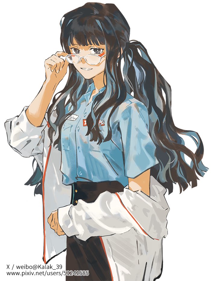 1girl adjusting_eyewear artist_name black_hair black_skirt blue_hair blue_shirt chinese_commentary collared_shirt commentary_request eyewear_on_head fate/grand_order fate_(series) grey_eyes jacket jacket_partially_removed kalak_39 long_hair looking_at_viewer multicolored_hair parted_lips pixiv_id shirt shirt_tucked_in simple_background skirt smile solo streaked_hair tenochtitlan_(fate) tenochtitlan_(fgo_mart)_(fate) two-tone_hair white_background white_jacket