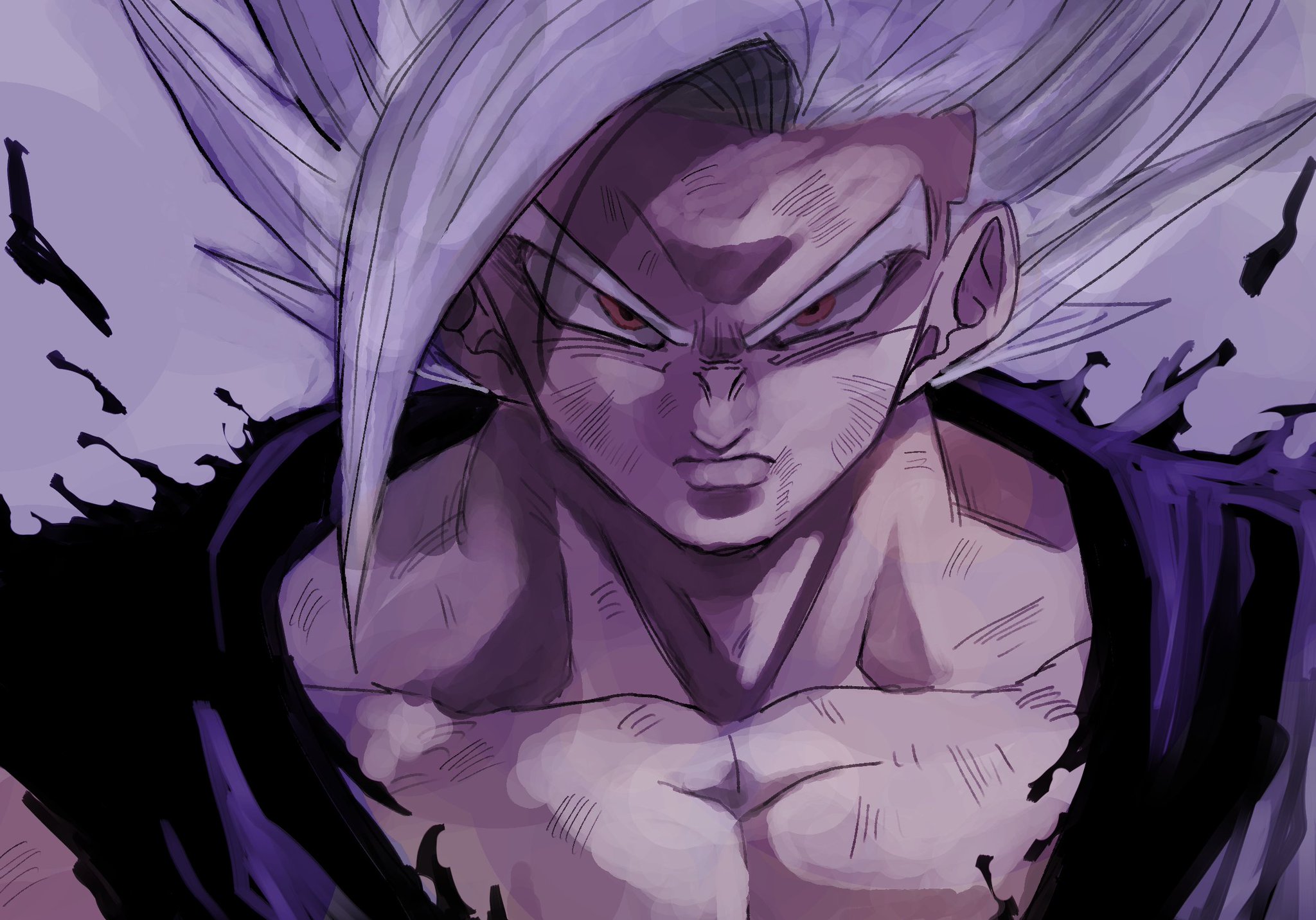 1boy angry black_vest closed_mouth commentary_request curtained_hair dragon_ball dragon_ball_super dragon_ball_super_super_hero gohan_beast grey_background highres long_bangs looking_at_viewer loose_hair_strand male_focus muscular muscular_male nose partially_shaded_face pectorals portrait serious shikemoku solo son_gohan spiked_hair torn_vest v-shaped_eyebrows vest white_hair